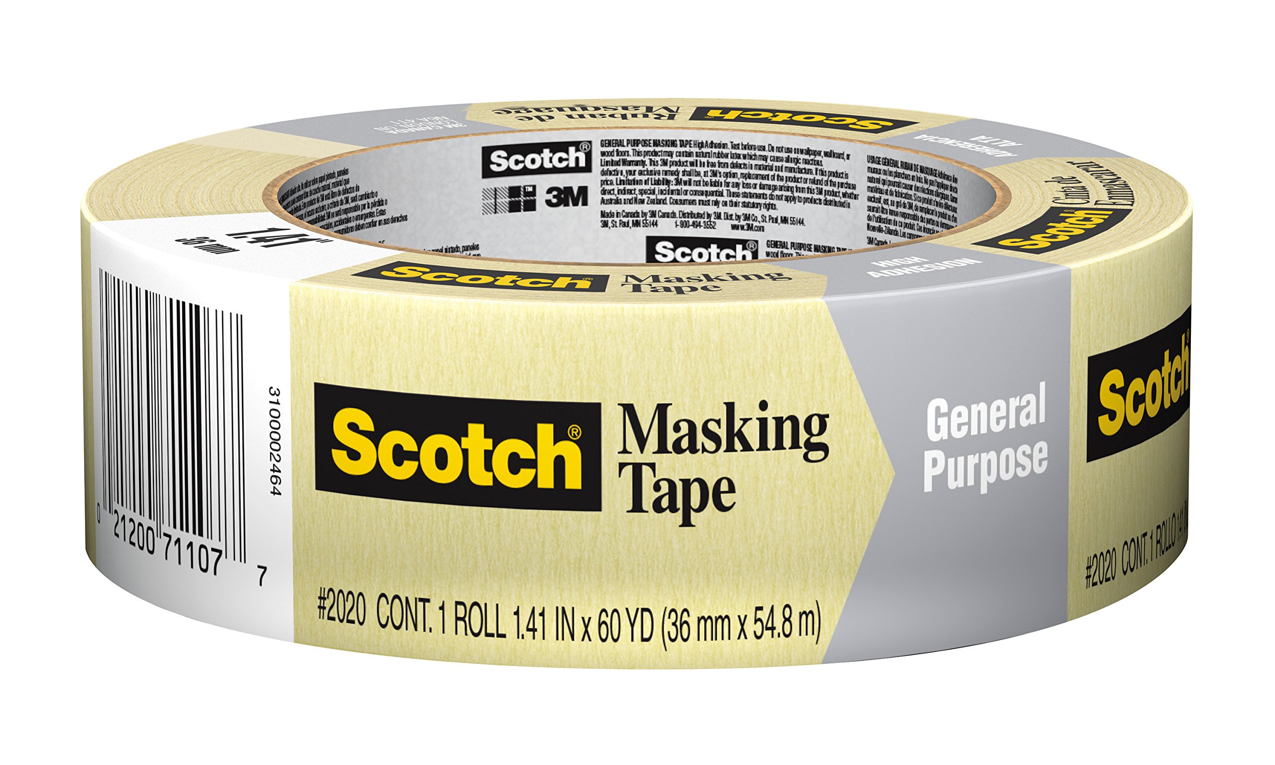 3M Scotch 2020 tan masking/painter’s tape comes in a 36 mm width, uses arubber adhesive and is packaged 24 per case. From the Manufacturer 3M General Purpose Masking Tape is 1-1/2 inches in width and comes on a 60yard roll. This tape is general purpose masking and has a high adhesion forgood holding power. It provides good paint lines. 3M’s wide range of maskingtapes lets you select the right tape for the right job and get professionalresults every time. Whether the job calls for a tape with low, medium or highadhesion, the 3M line delivers the performance you can rely on for qualityworkmanship.