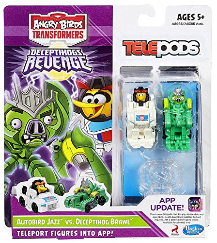 Build – destroy – win! The Angry Birds Transformers toys put you in charge ofyour own bird-on-pig battles. And what could be better than high-flying birdsand villainous pigs re-imagined as Transformers characters? This battlepackpits your Autobird Jazz bird against your Deceptihog Brawl pig, and they canboth convert from bird or pig mode to speedy racer mode and back! It’s easy totake your games online with the Telepods base, which lets you teleport yourbird and pig into the Angry Birds Transformers app. Just put one of them onthe base and put the base on your device (sold separately) and scan it intothe app. Now you can play as that converting pig or bird! It’s going to betotal destruction in the battle between your Angry Birds Transformers bird andpig!