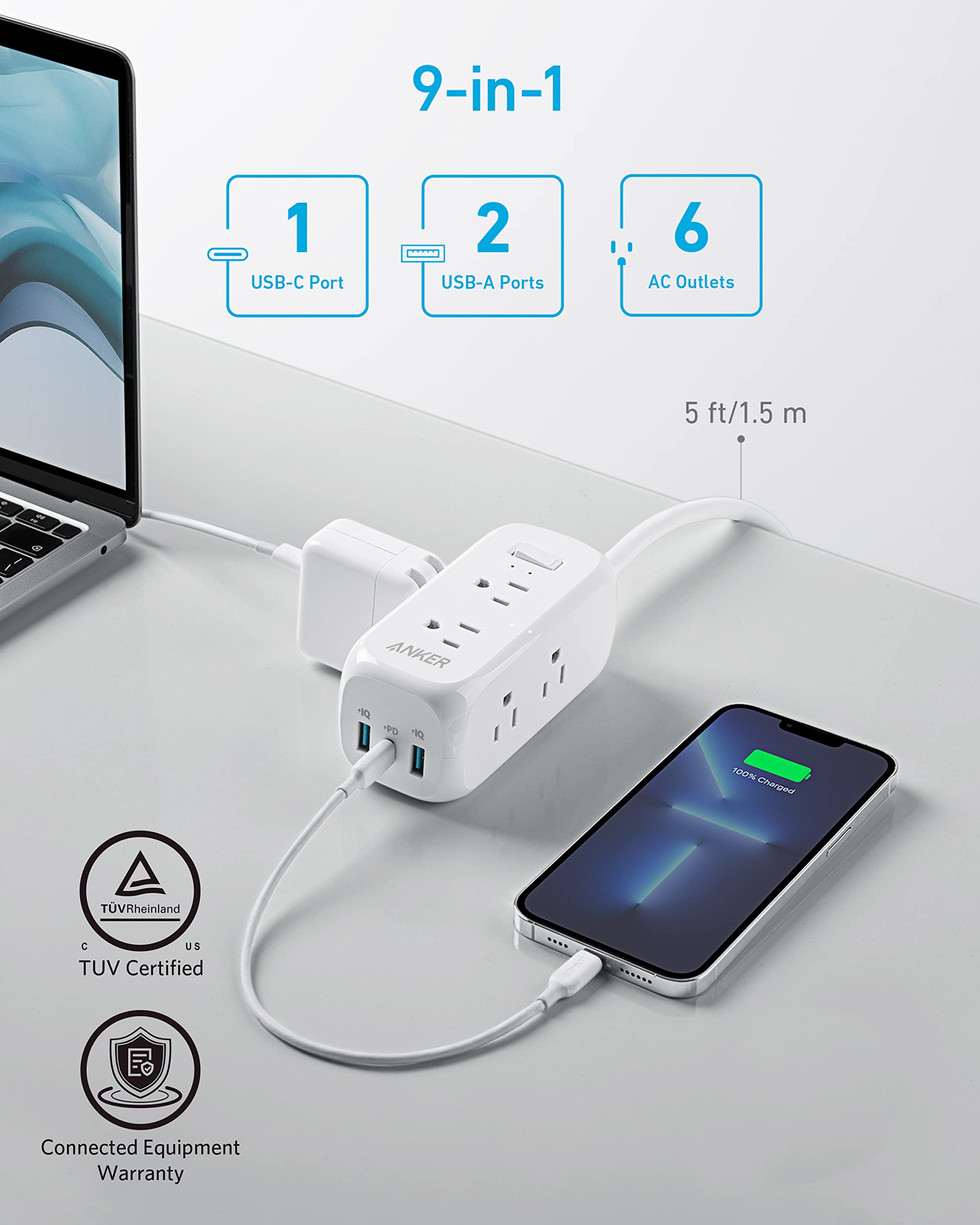 - Power Up to 9 Devices: 6 AC outlets, 2 USB ports, and 1 USB-C port power everything on your desk from a single compact device.