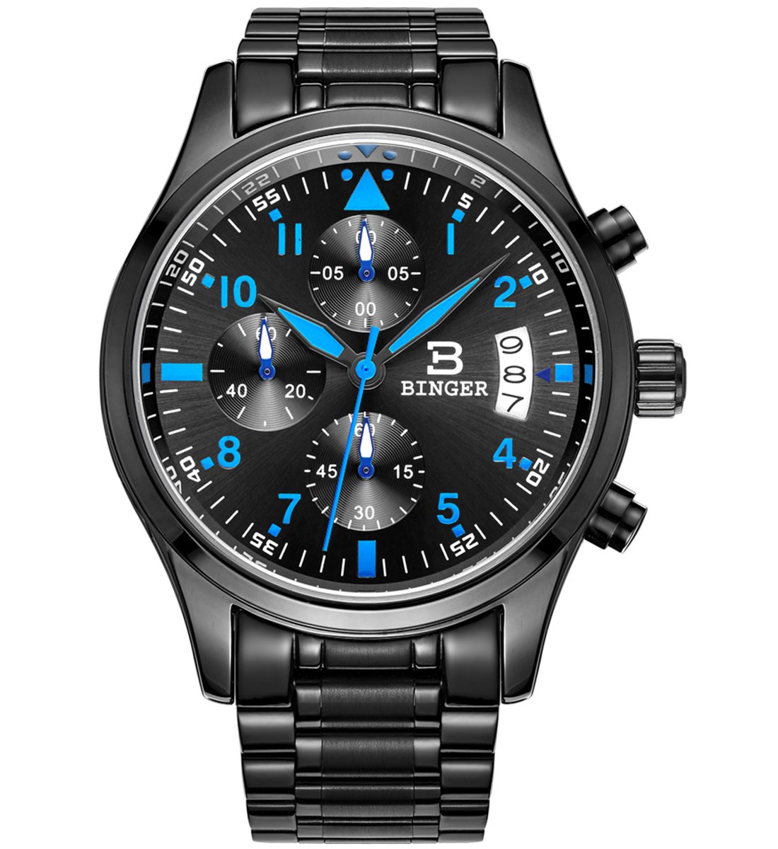 BINGER Date Black Military Multifunction Chronograph Mens Watches Stainless Steel Luminous Blue Numerals