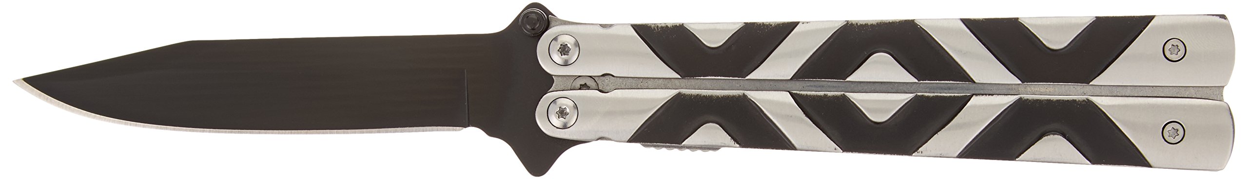 The BladesUSA Fantasy Folding Knife (model C-1130) features a black straightedge blade and a black/silver handle, with a 4-3/4-inch closed length.Although at first glance this knife resembles a butterfly knife, it is not.Once open, the blade locks securely into place with the use of its liner lock.This knife features a features a 3-1/4-inch, 440 black stainless steel blade.This knife has a two-tone black and silver aluminum handle that makes an XOXpattern on it.