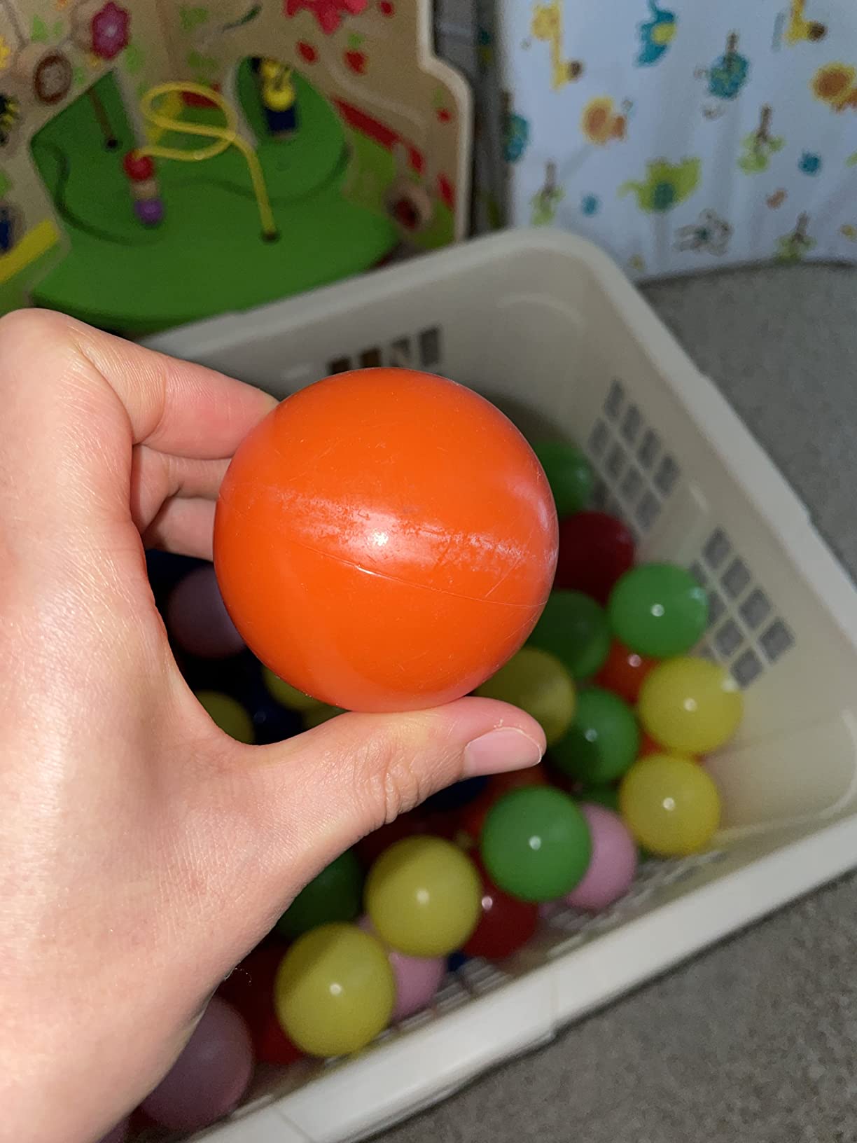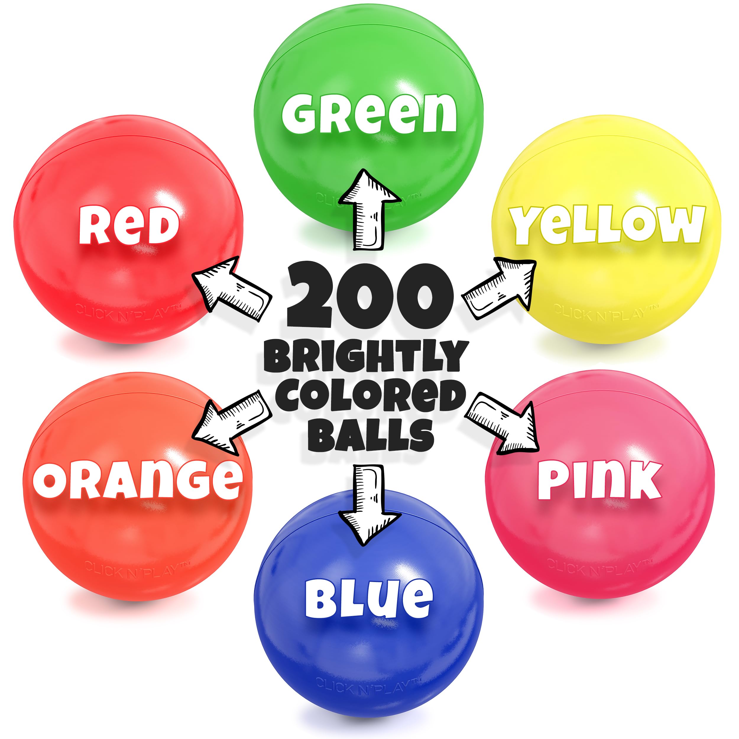 - Child-Sized – Click N' Play's value pack of 200 ball pit balls is an assortment of 6 bright and attractive colors: blue, red, pink, green, orange and yellow. Each small ball pit ball measures 2. 3 inches in diameter – the perfect size for a toddler or child's hand.