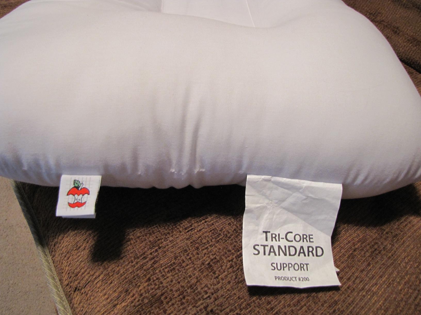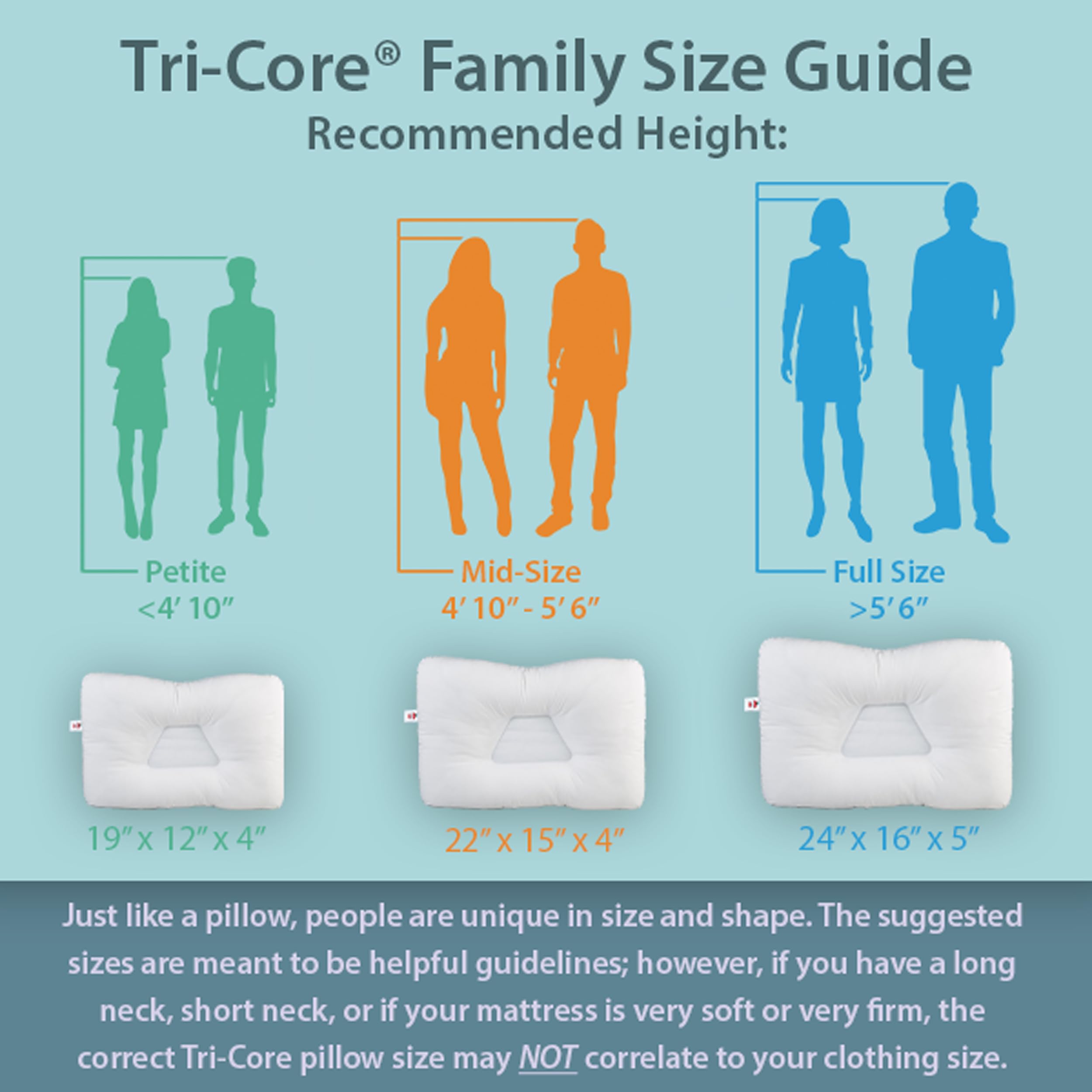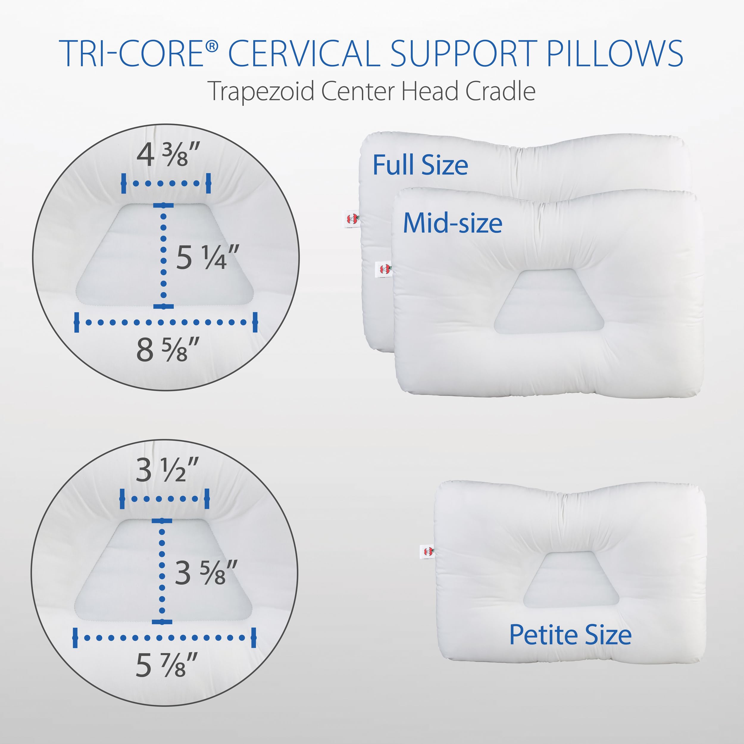 - SIZE/MATERIAL/ORGINS/USE: Full Size, Firm, White 24 inches x 16 inches; Assembled in the USA of Globally Sourced Materials; No latex; Fits a standard size pillowcase; You may need time to adjust to the pillow over several weeks, immediate overuse may increase neck pain; Alternate between Tri-Core and current pillow while your body adjusts