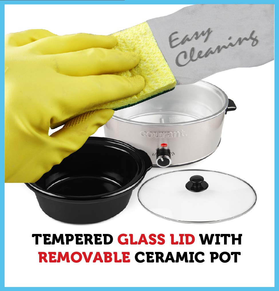 - Slow Cooker features Non-Stick, Removable, and Dishwasher-safe stoneware Crock insert. Cleanup is a breeze with the dishwasher-safe crock and tempered Glass Lid.