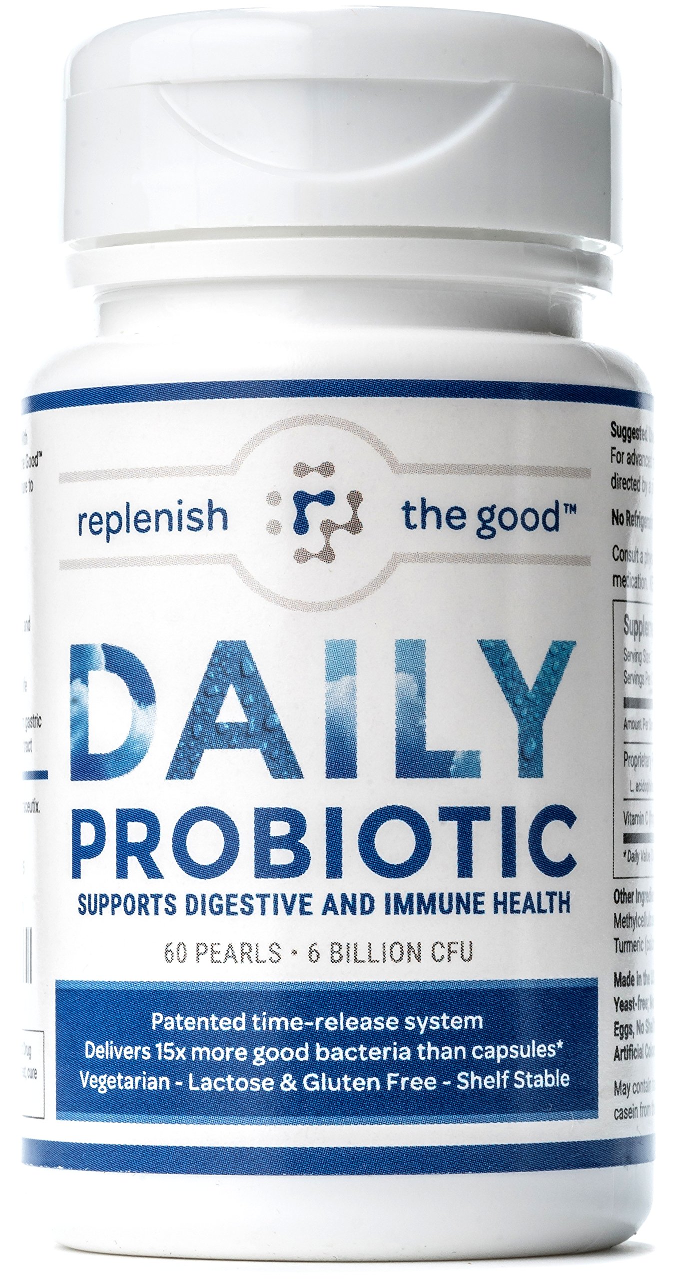 WE FEEL YOUR PAIN! WHY REPLENISH THE GOOD WAS CREATED.Our Co-Founder Scott has dealt with digestive issues throughout his adult life- IBD, Ulcerative Colitis & Celiac disease. Due to infections, he was on continual antibiotics for over 5 years, which led to massive depletion of his gut flora. He began doing research into the benefits of probiotics, and was surprised to learn that many probiotics do not survive on the shelf or through the stomach acid. So Replenish the Good was born to offer a line of probiotics with superior survivability. We carefully select strains and use multiple patents to ensure the beneficial bacteria reach the intestines alive. Replenish the Good Daily provides 15x better bacteria survivability than capsules. With a daily regimen of Replenish the Good Probiotics, Scott is happy to report that he has improved digestion, energy and mood, and has reported no further infections despite removing antibiotics from his daily regimen. We stand by our products and offer a 100% satisfaction guarantee! Formulation. 6 Billion CFU & 6 resilient strains selected based on recent groundbreaking clinical data that have proven health benefits. Our proprietary Daily formula has an optimal balance of CFU count for each strain to help ensure enough good bacteria survive. Contains L. acidophilus, L. plantarum, B. lactis, L. brevis, L. rhamnosus, B. longum. It contains all of the top strains recommended in the book Brain Maker by Dr. Perlmutter. Shelf Life: patented LiveBac® process extends shelf life to 18 months from date of manufacture without refrigeration. Most companies won’t tell you how many viable bacteria will be left at expiration because often there are none left! We guarantee 6 billion CFU at manufacturer and 2 billion CFU at expiration which is 18 months from manufacture date. Delivery: patented BIO-tract® provides protection from gastric acid & time release delivery.