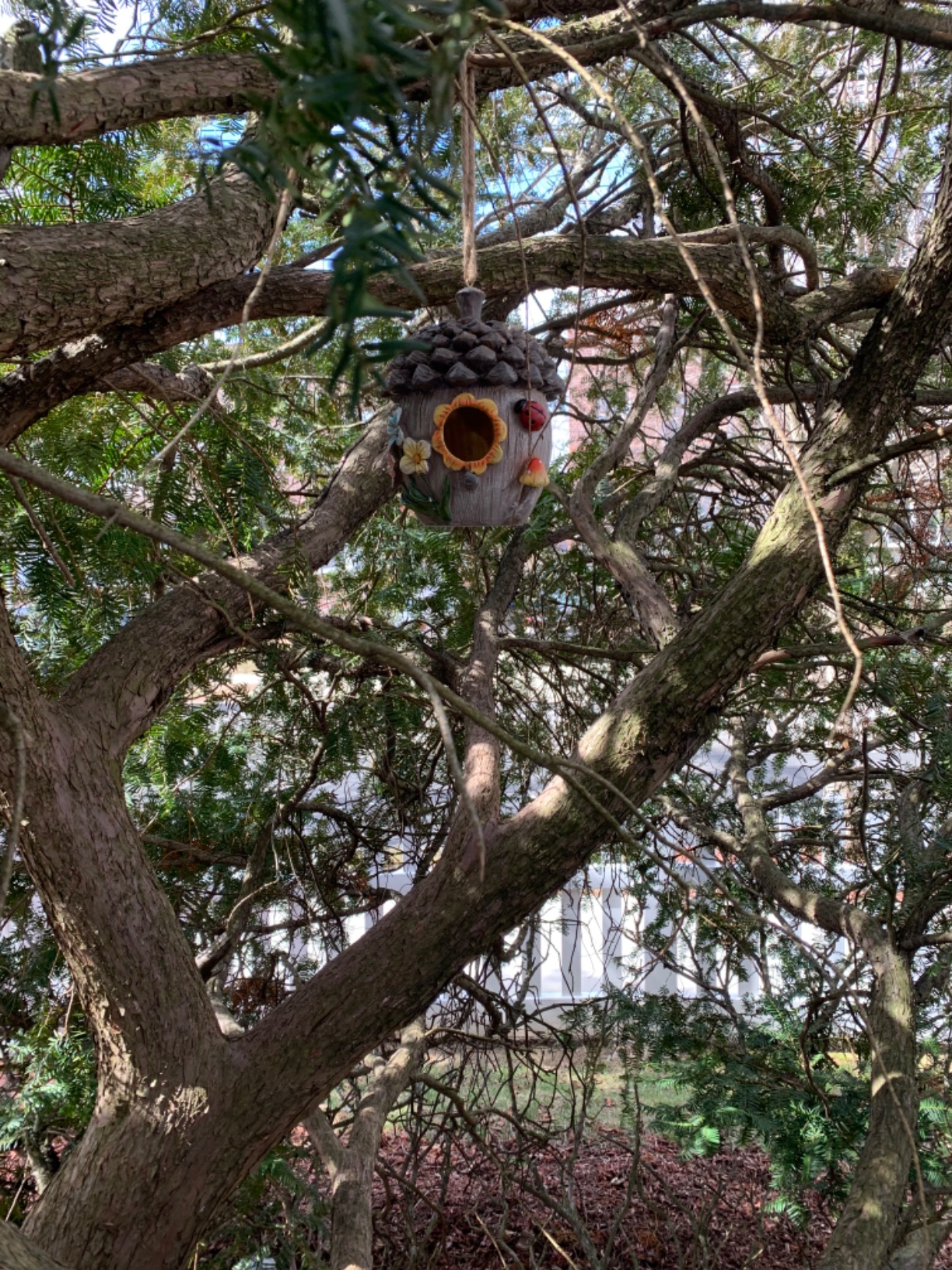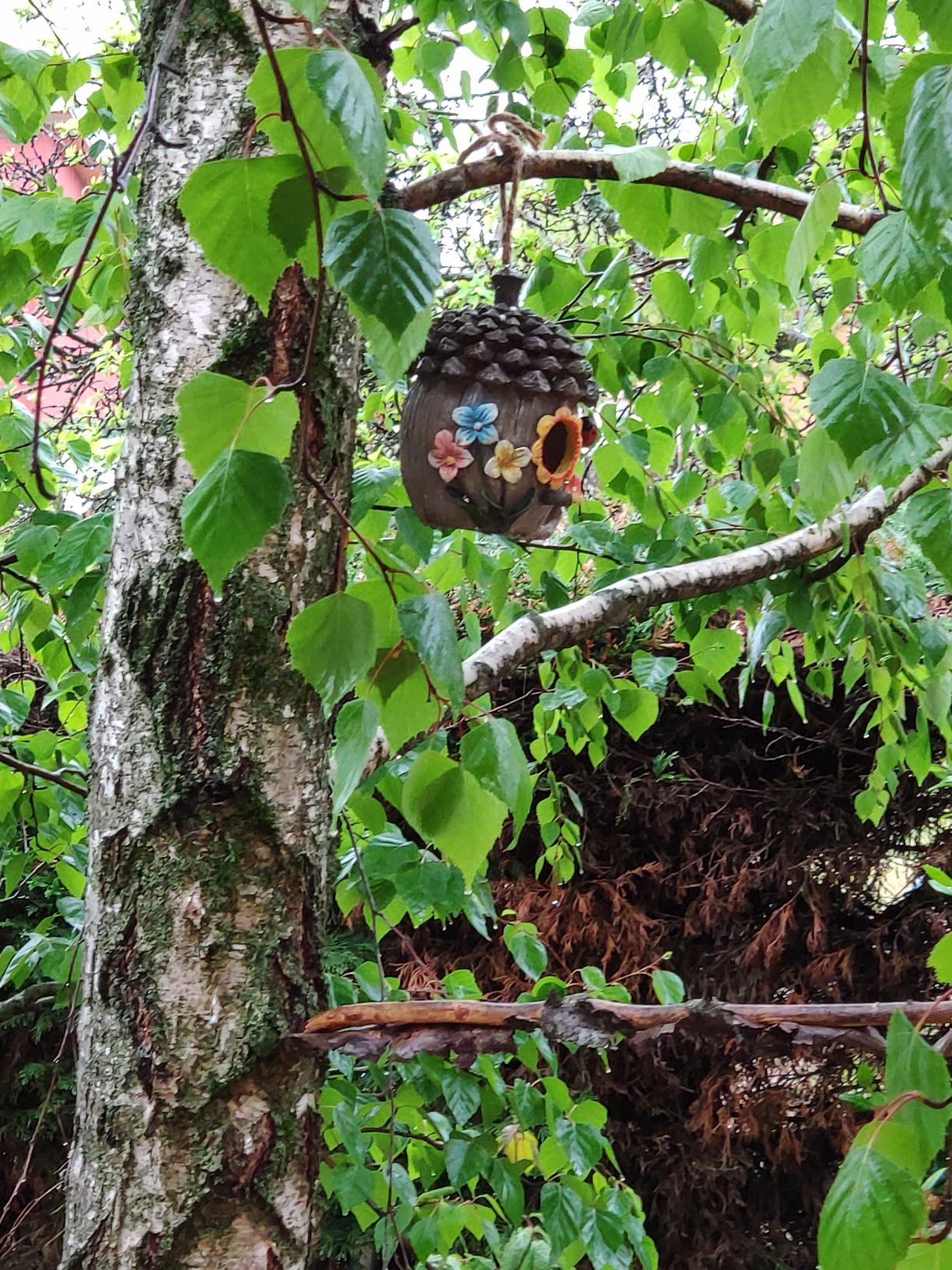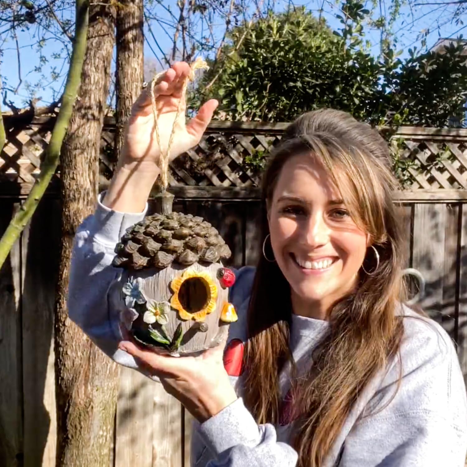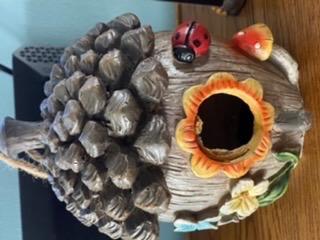 - Add character and beauty to your garden with this uniquely crafted and designed, hand-painted birdhouse.The perfect addition to your deck or patio.It includes jute cord attached securely for hanging.
