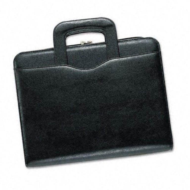 - Inside features business/credit card slots, I.D. window, large vertical pocket can hold file folders, zip pocket for loose items, self-close pocket for phone or calculator, pen loops, and pocket on right for note pad