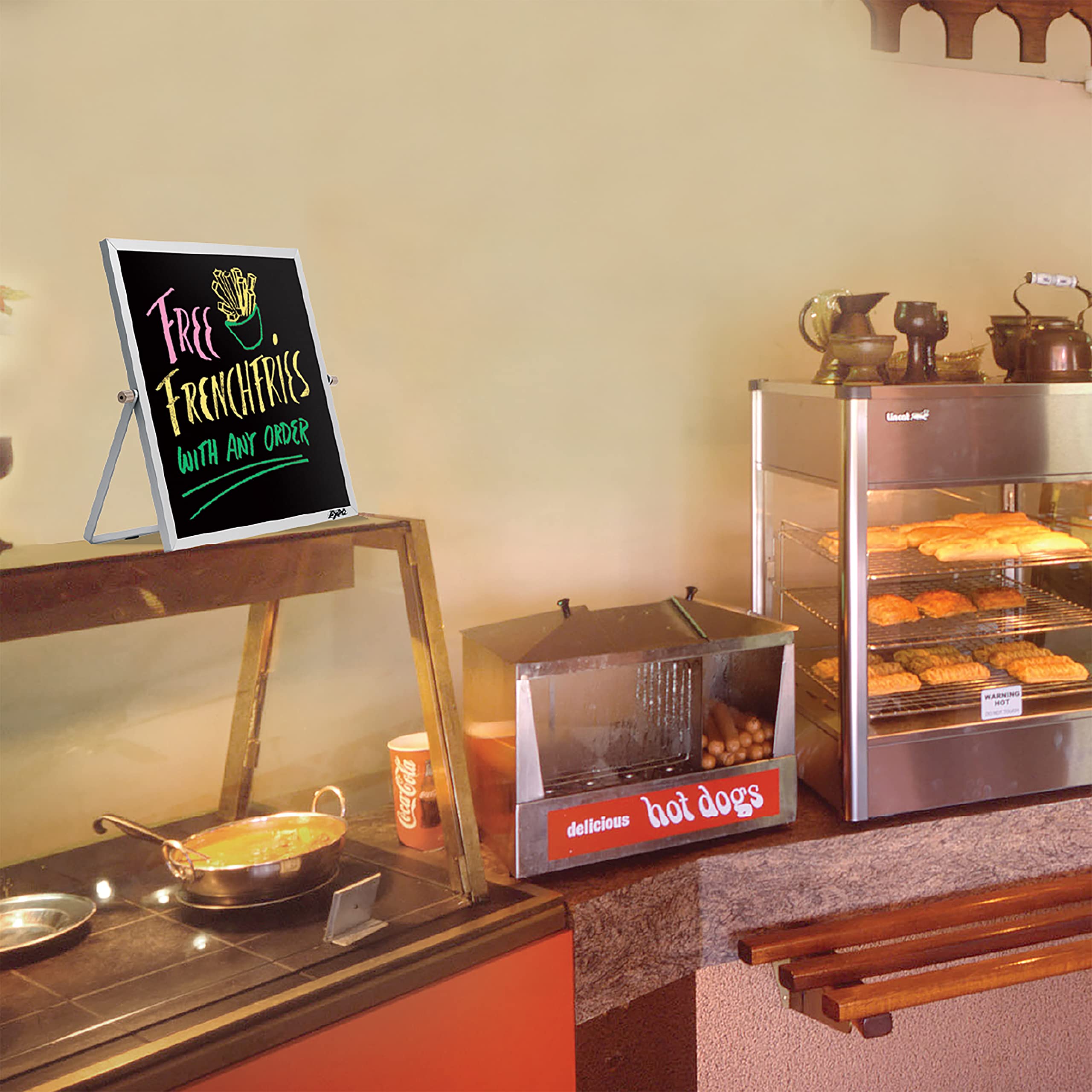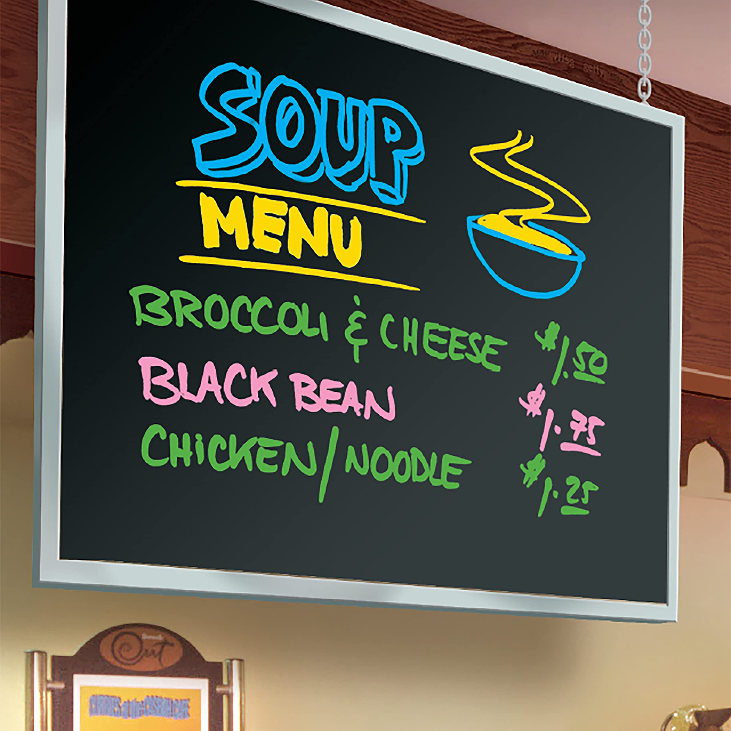 Draw bright, eye-catching displays and messages on black marker boards, glass