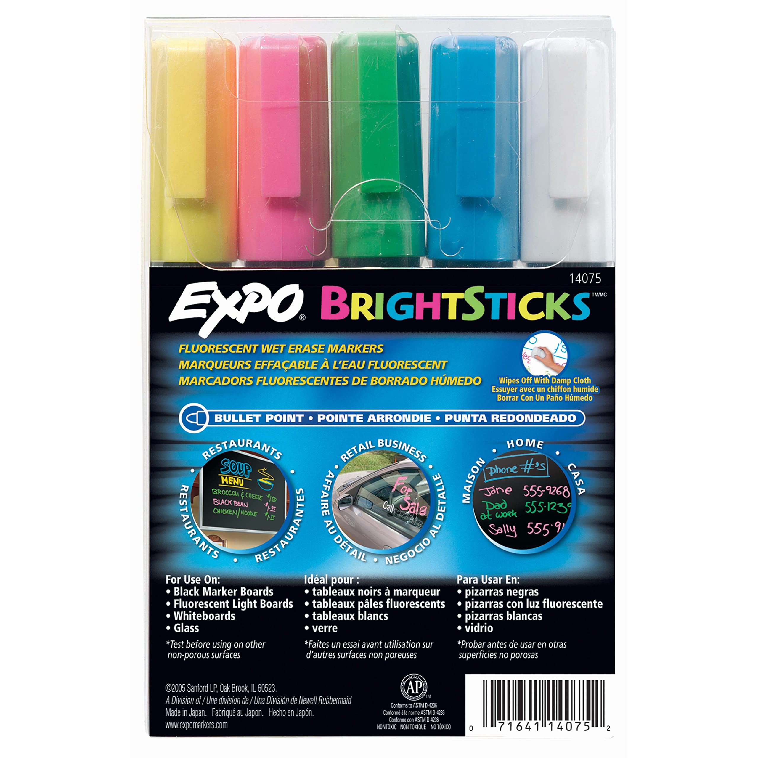 EXPO Bright Sticks Wet Erase Fluorescent Markers, Bullet Tip, Assorted Colors, 5 Count