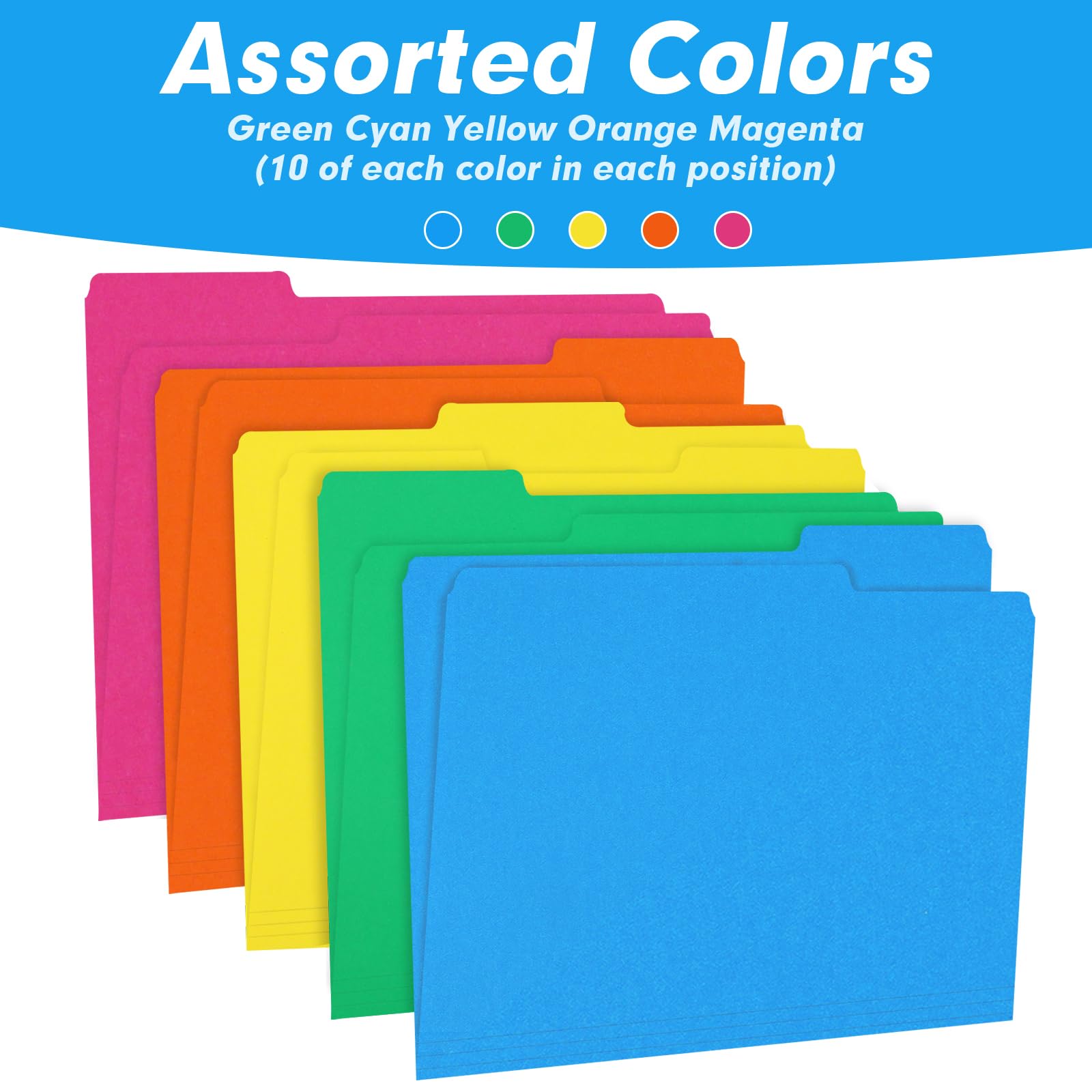 - COLORED FOLDERSColor file folders in 5 colors (green, cyan, yellow, orange and magenta) to make color-coded, for better sorting and classifying, speed filing and retrieval times.