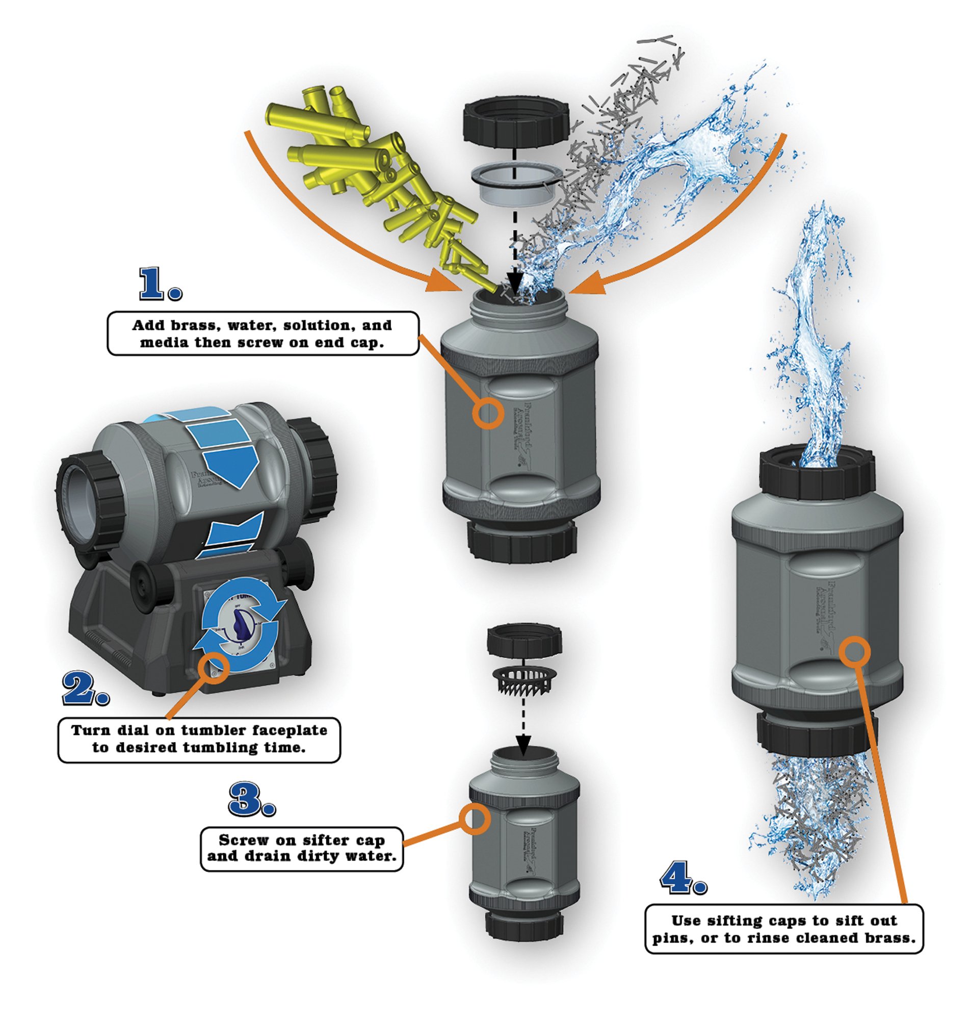 - VERSATILITY: This tumbler can effectively clean without the use of stainless steel media pins and can clean using a mixture of brass cleaning solution and water