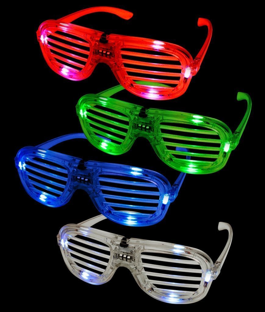 Size: 12 Pieces | Color: Assorted – Light Up These Kanye West style slotted shades are one of our coolest and most popularitems! These eye glasses feature 6 bright LEDs per color. 3 different modesare available: fast flashing, slow flashing, and constant. The on/off buttonis also used to change the mode. Batteries are included and installed. Anassortment of 12 shades are included in each box.
