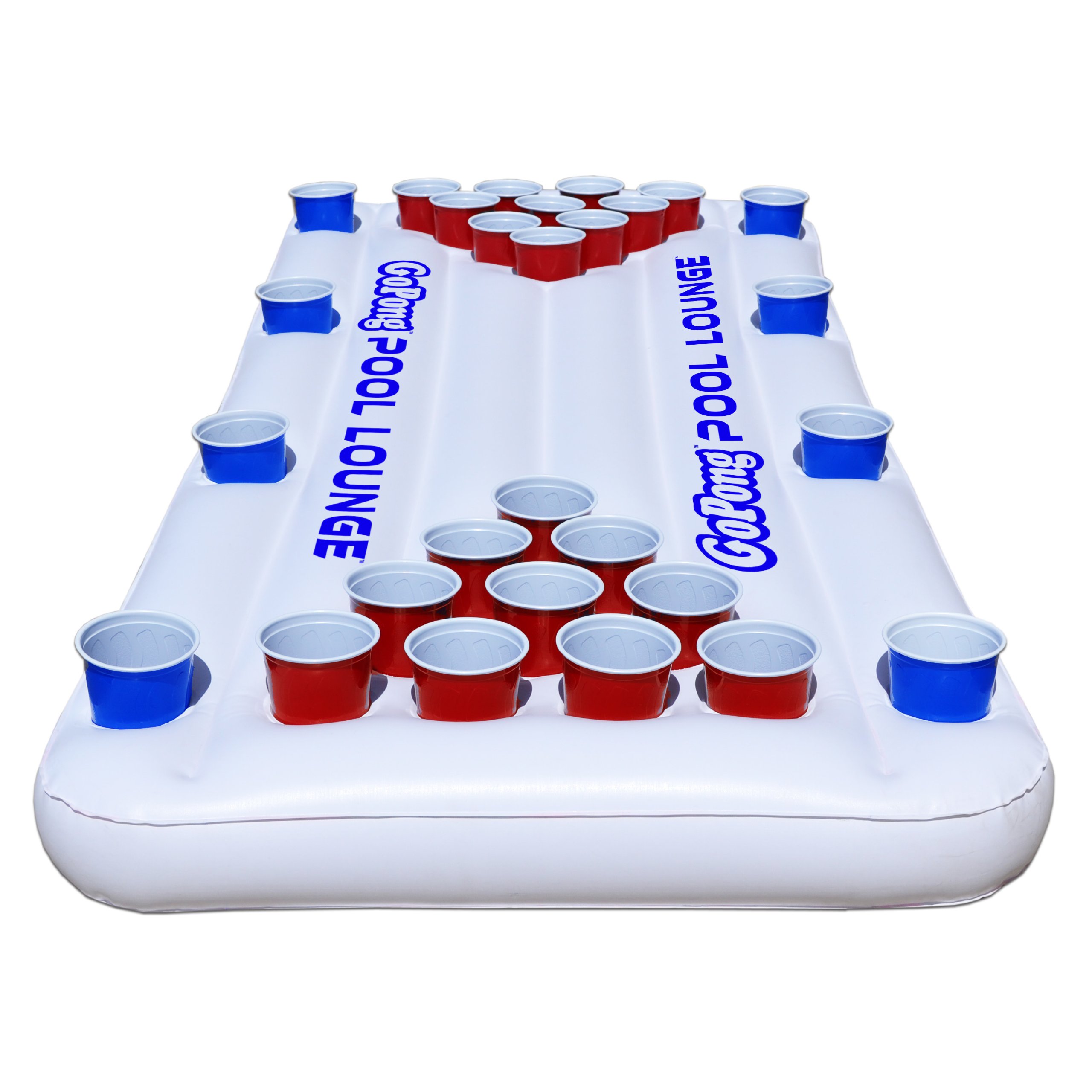 Go Pong’s Pool Pong Lounge is a premium 6ft floating beer pong table withbuilt in cup holders for Social Floating. This product is essentially aversion of our popular Party Barge, but without the built-in cooler. The 6ft x3ft table includes 10 cup triangles on each end for full size pool pong play.Each side of the raft is also lined with 4 cup holders for social floating, soyou and your friends can float and socialize around the table between ponggames. The Pool Lounge can also be used as a floating tanning lounge if you’reever able to get it all to yourself. The Pool Lounge includes 3 pong balls(cups not included) and is retail packaged. This is a must have for springbreak, summer pool parties, or lake boating. Manufacturer’s Note: We inflationtest and quality check all rafts before they are packaged, but rarely a badunit will still slip through. If this happens, we will immediately send areplacement or issue a refund as customer service is our top priority.