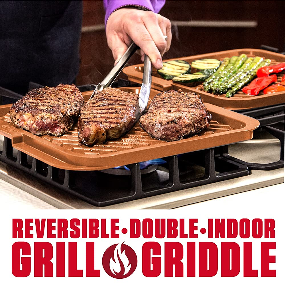 - REVERSIBLE GRILL & GRIDDLE – the Gotham Steel Indoor Grill & Griddle Pan fits perfectly over your stovetop and can be used to grill burgers, steaks, chicken and bacon & flipped to fry eggs, pancakes & so much more