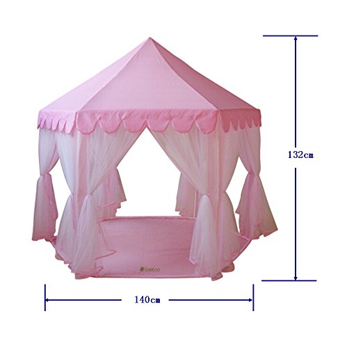 Description: The Princess Castle Play Tent Fairy Princess Castle Tent is thenewest design by GreEco. An adorable gift for all children — different colorsavailable for your young prince or princess. Playing dress-up, have fun withfriends, or read, etc, your kids will love this play tent definitely! Encourages dramatic play and provides hours of fun for kids! Inspirechildren’s imaginations while giving them a private space of their own.Features: Tent Dimension in inch: 55″ (Diameter) x 53″ (H). Speciallydesigned hexagon, provide a perfectly sized space, giving your children plentyof room to stand and play, even an adult can fit inside. Made with durableand log lasting polyester blend fabric.This is not camping gear it is forhours of indoor / outdoor fun. All materials including the fabric/mesh/polesare durable, soft and light weight, compliant with CPSIA COMPLIANT and LEAD &PHTHALATE FREE, safe for play! Your young princess can easily to assemble herown castle under adult’s supervise. Fast and easy set up/breakdown with notools required. Your child will be able to begin playing right away withoutwaiting through complicated assembly. Easy to move or take down when not inuse. Comes with a carrying bag, making it easy to store when it’s time to putthe tent away. Easy to clean with damp cloth & mild soap.Hand washingsuggested. Guarantee:If you are not 100% satisfied for any reason, Please”Contact Seller” directly, seller aims to provide hassle-free service andpromise replies all emails in 24 hours. Or from Amazon Buyer Central againstthis order for replacement or refund. No hassles, no delays, and no questionsasked! IMPORTANT NOTE: “GreEco” is a registered trademark in the UnitedStates. Any seller without authorization to sell its products constitutes aviolation of trademark rights, copyrights, and Amazons ParticipationAgreement.