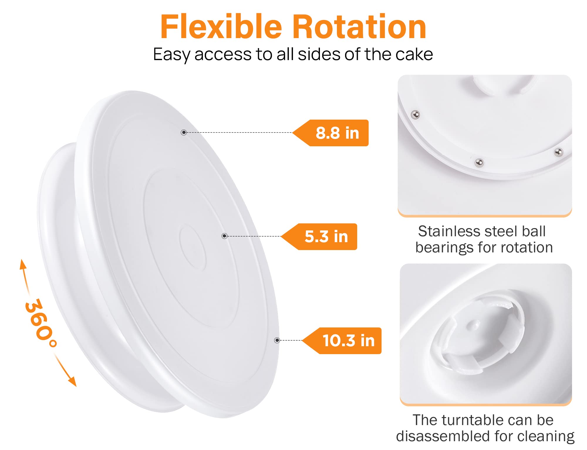 - 360 Spinning Cake Turntable: The cake turntable has an 11-inch diameter and spins smoothly on a hidden ball bearing, making it easy to achieve stunningly consistent patterns and gorgeous designs. With 360o clockwise and counterclockwise spinning, you can decorate cakes like the pros.