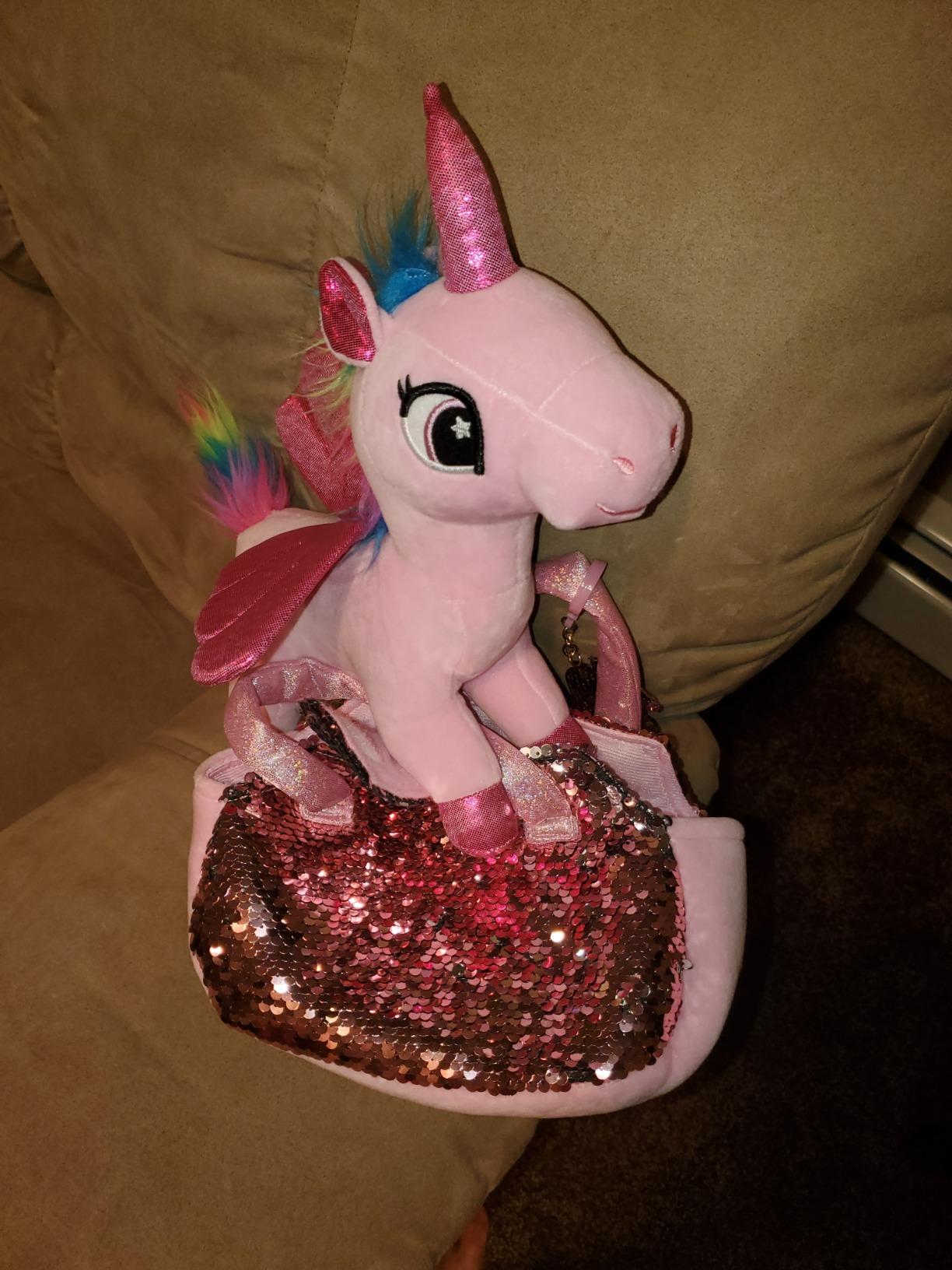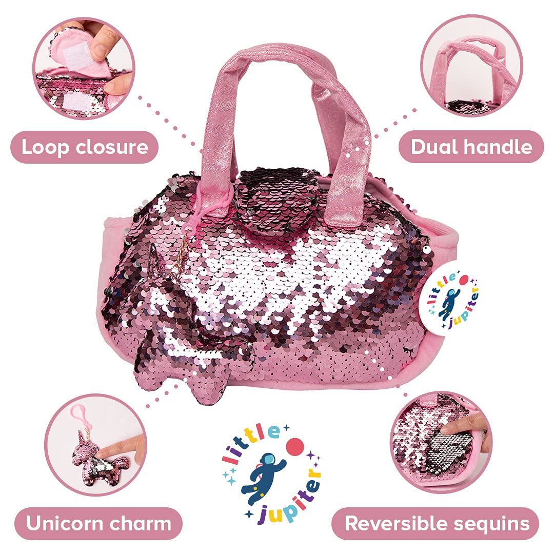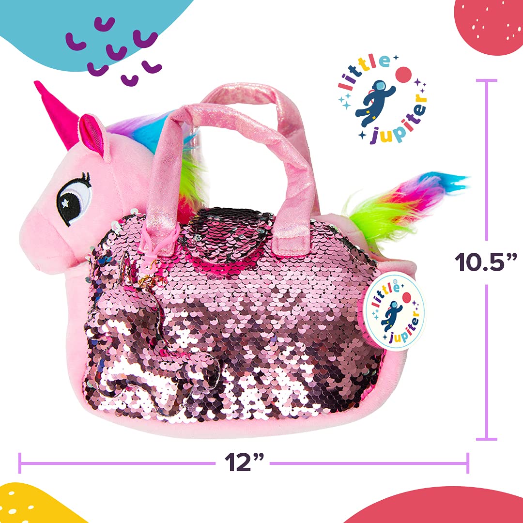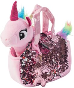 - Flippable Sequin Bag: Girls will love the mini pet bag with reversible sequins & charm. The handbag features colorful sparkles that flip from pink to silver. An awesome stuffed unicorn for girls 4 & up.