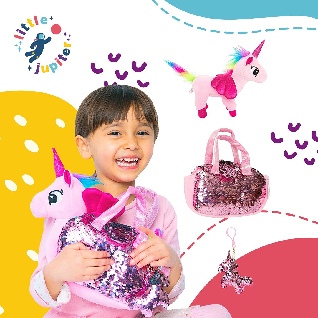- Complete 3 Piece Plush Unicorn Playset: Includes stuffed toy unicorn, sparkling carrier purse bag with reversible sequins, and charm. The perfect unicorn plush toys for girls.