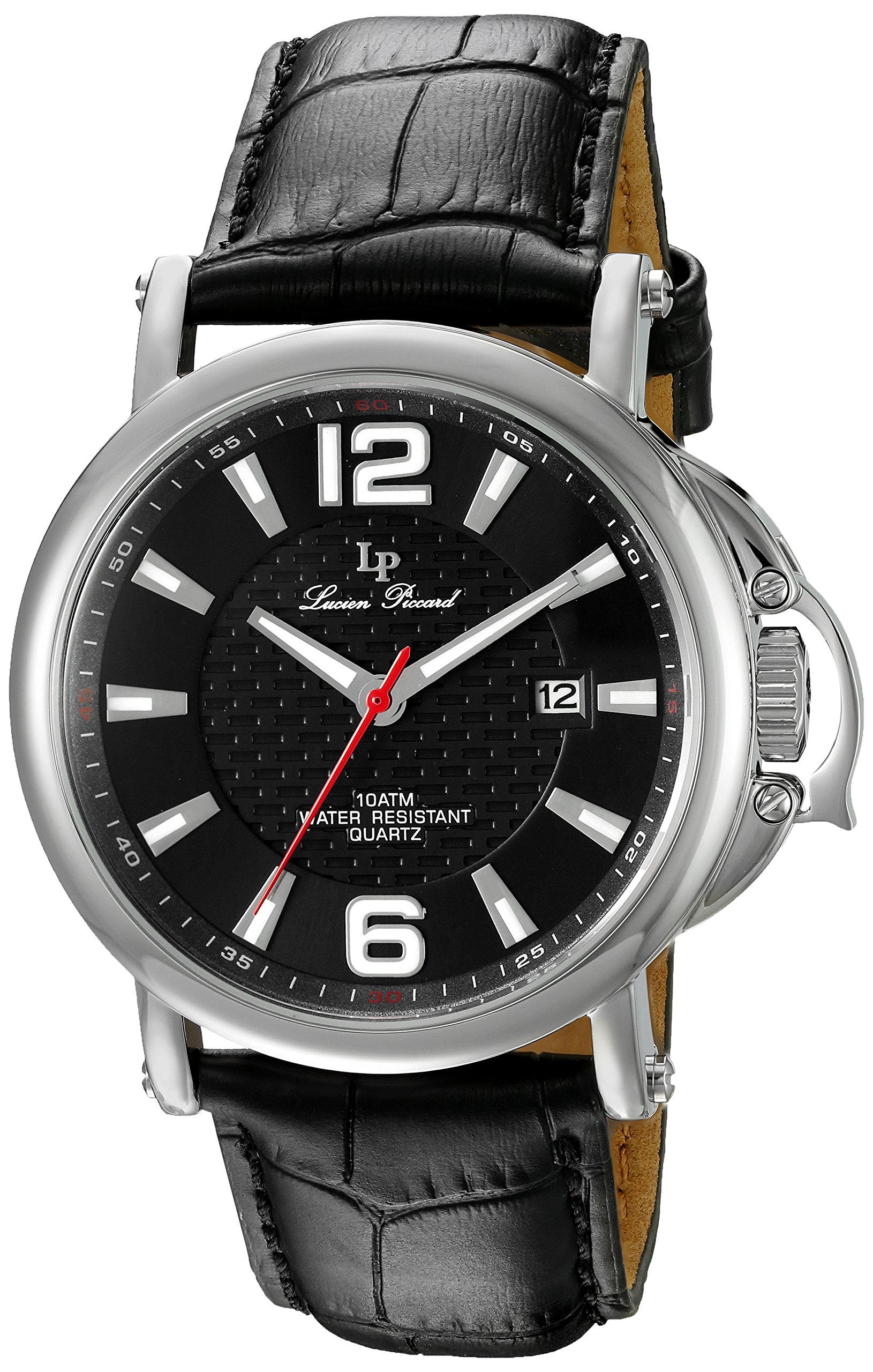 A victorious profile from the new Lucien Piccard Triomf series. Classic,contemporary men’s watch adds a look of elegant sophistication to the wristand is right for today and always. The generously sized 44mm diameter case inyour choice of stainless steel and rose gold-tone stainless steel is highlypolished to a lustrous patina. A protective clasp cover on the crown addsdistinction. The striking leather strap with crocodile-textured detailcompletes the look. The perfectly round dial features a handsome blend oftextures and backgrounds, along with polished sword hands, Arabic half hourmarkers and luminous index markers.