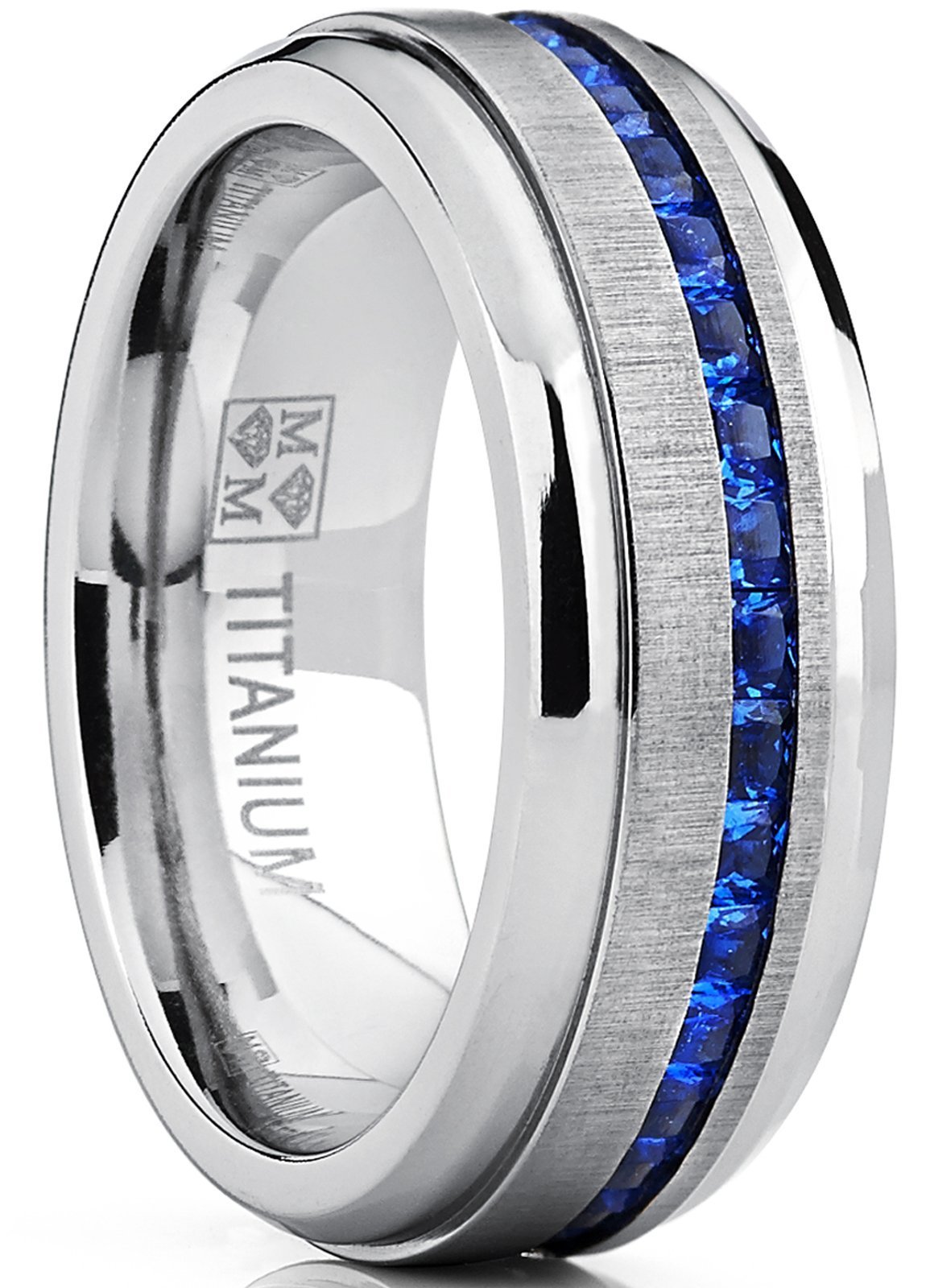This stylish eternity ring is 8mm in width and comfort fit. It has ahorizontal brushed raised center with channel set blue princess cut cubiczirconia. Our rings are hypoallergenic and come with a 100% money backguarantee. FREE ring box included with purchase.