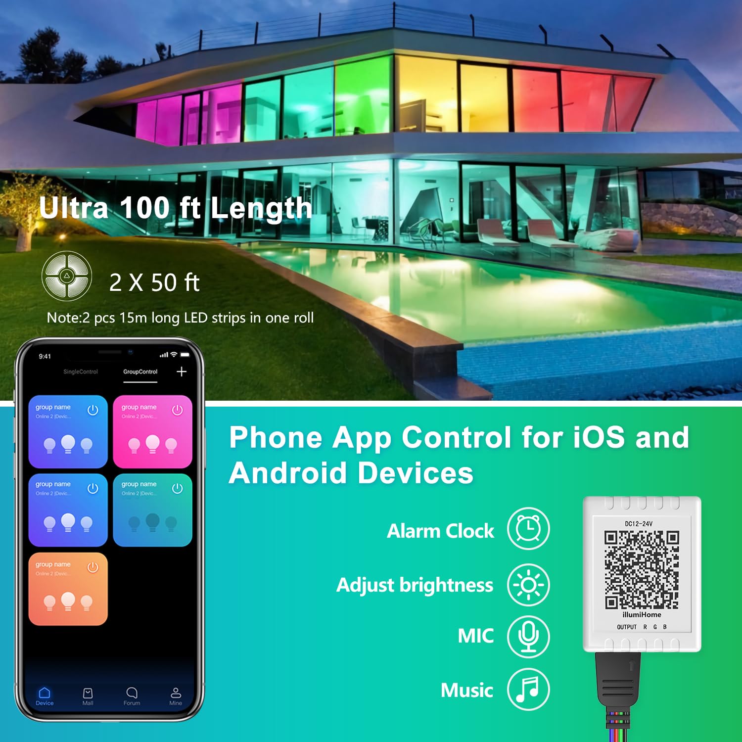 Nexillumi 100 ft LED Lights for Bedroom Music Sync Color Changing RGB LED Strip Rope Lights General Remote, 5050 RGB LED Light Strips(APP+Remote+Mic)