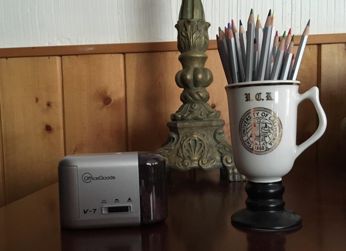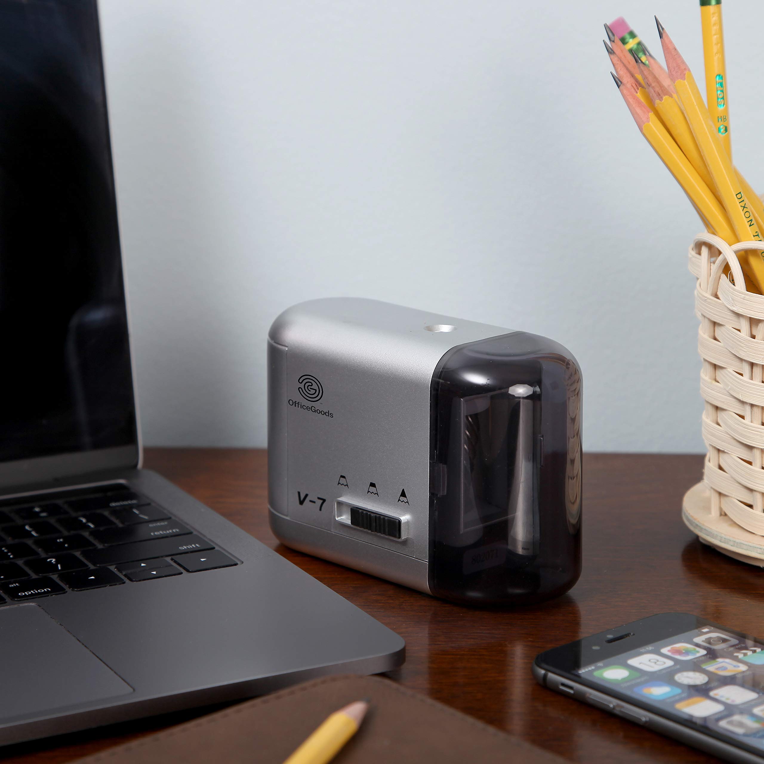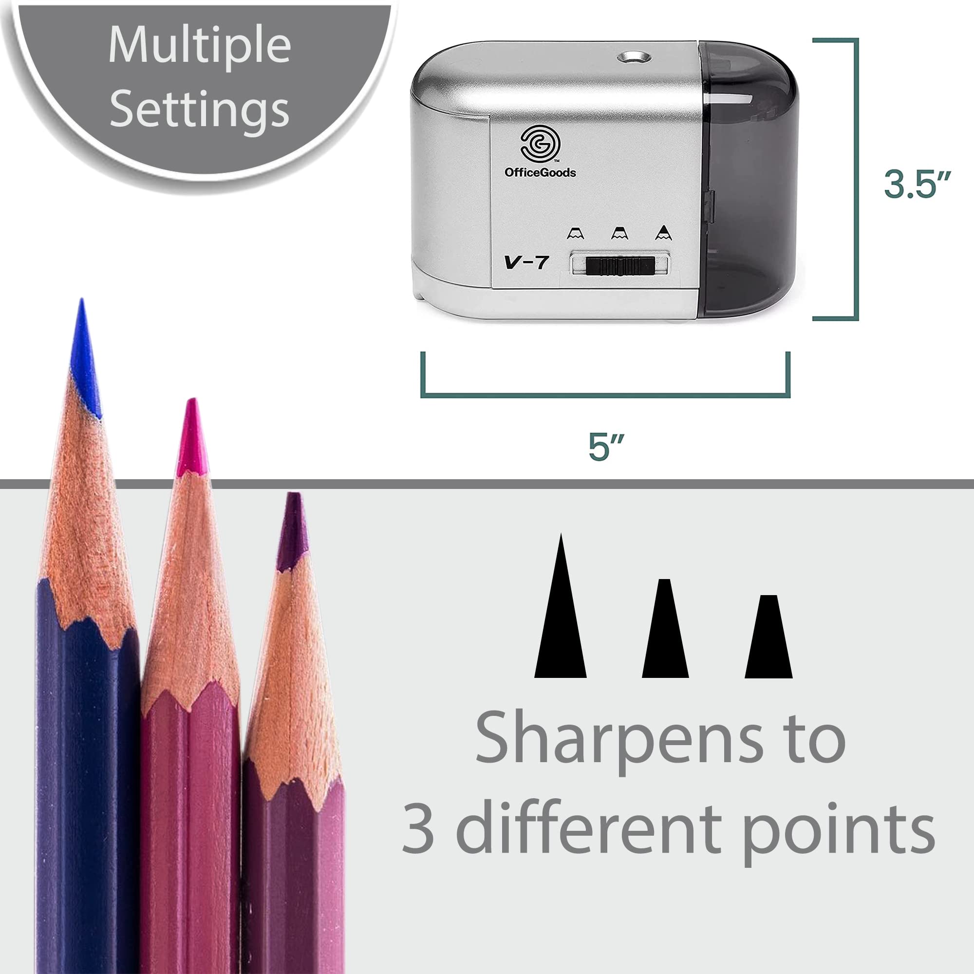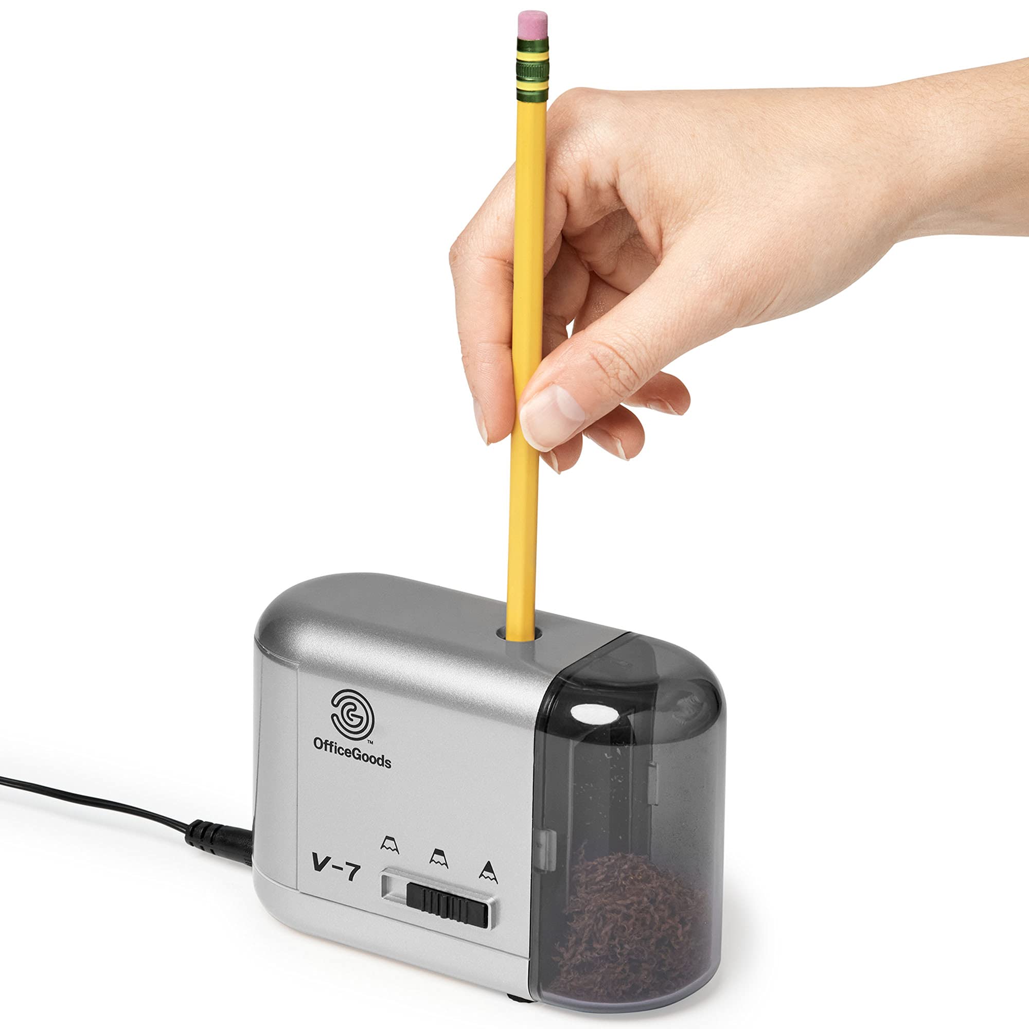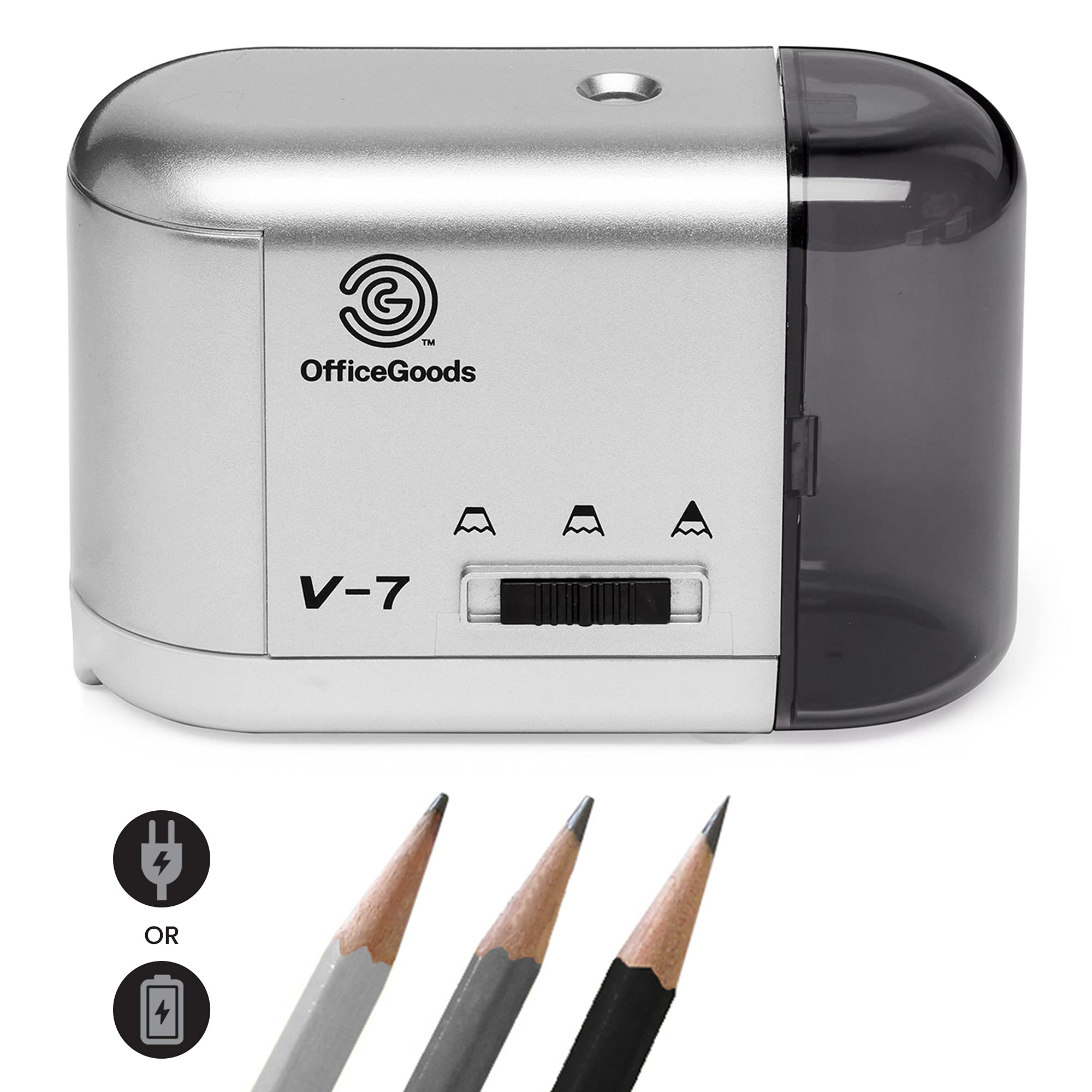 - Stay sharp and in style with OfficeGoods Battery Operated Pencil Sharpener. This is easy to use sharpener that fits standard-sized pencils, and even some brands of thicker colored pencils. The sound of the motor changes to indicate when the pencil is sharpened. The ability to choose three different points makes this ideal for artists, architects, and other professionals.