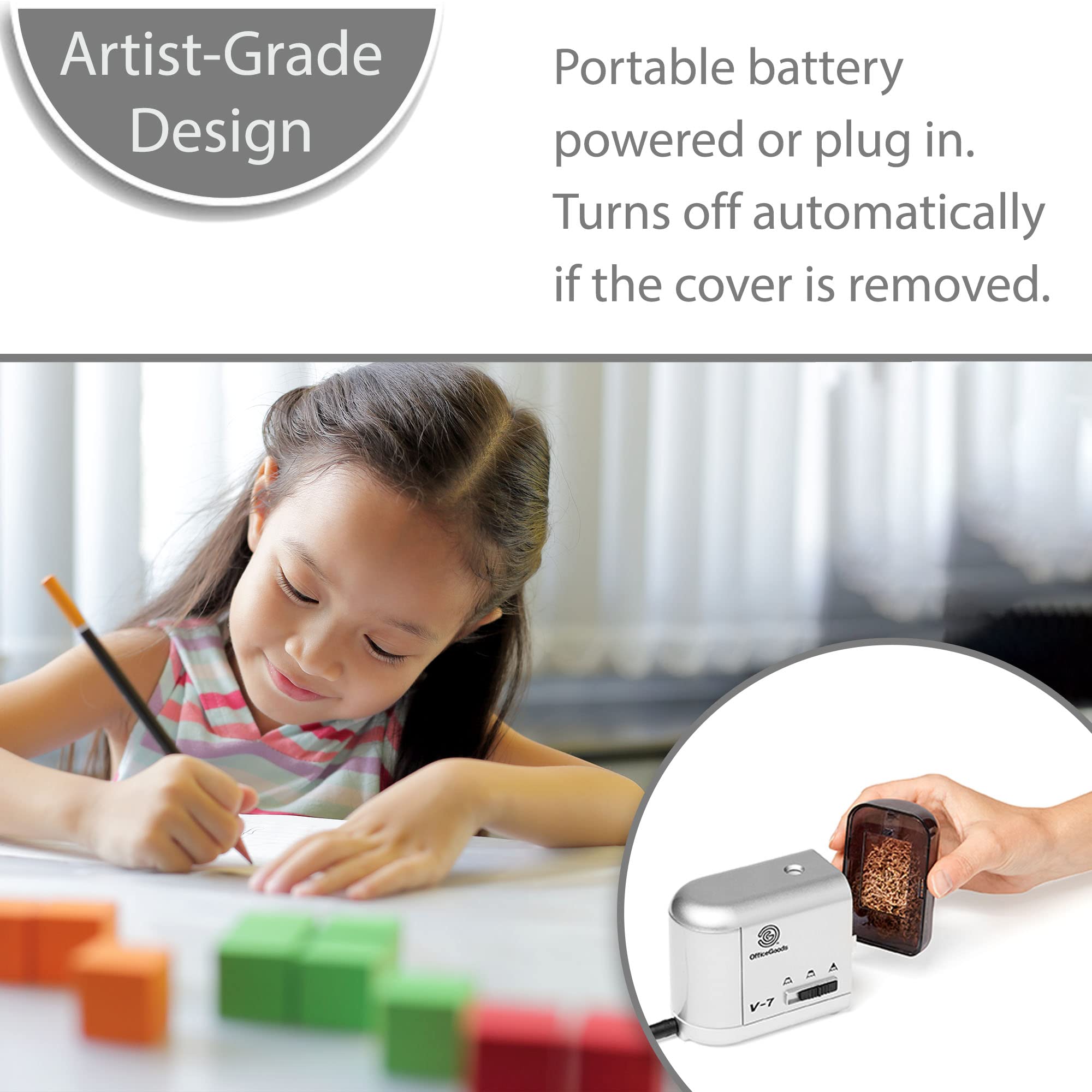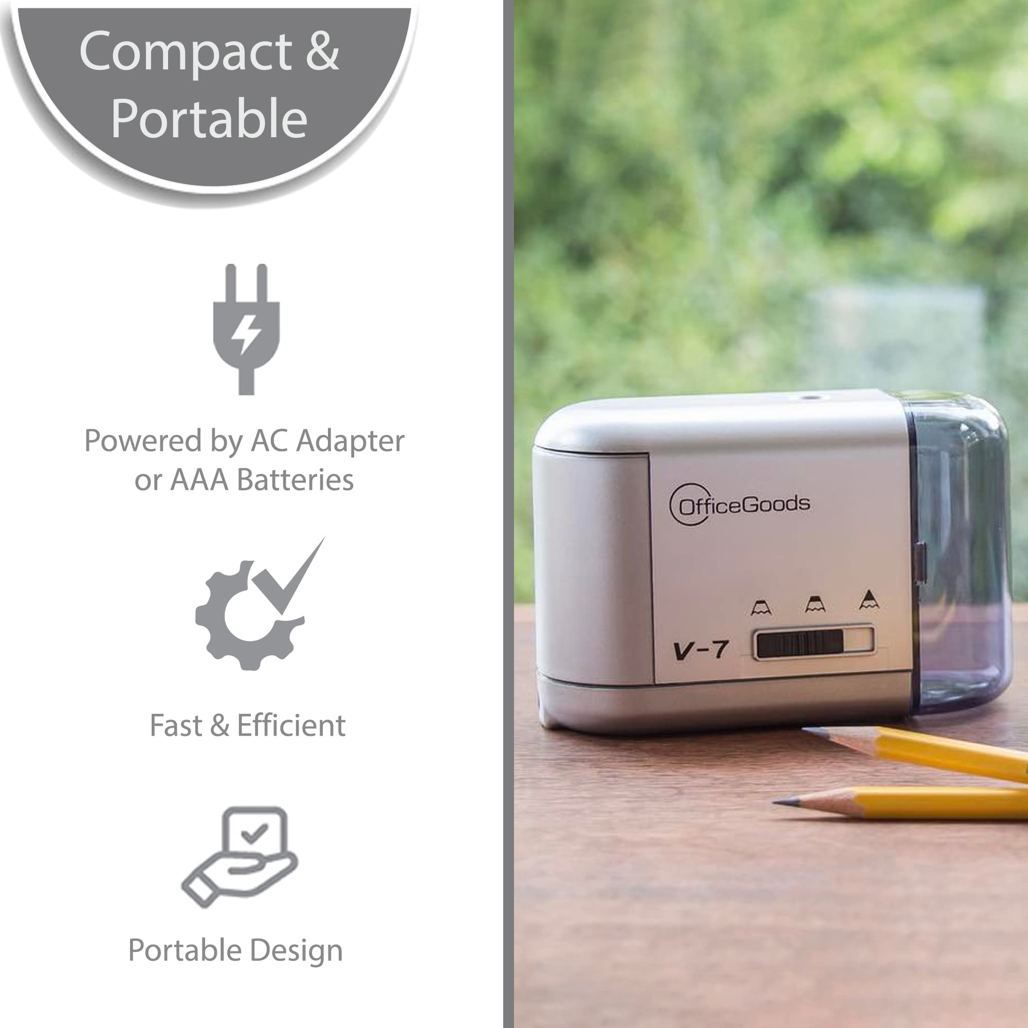 OfficeGoods Electric Pencil Sharpener – Battery or Cord Powered Portable Sharpener – Perfectly Sharpens Colored Pencils, Drafting Pencils for Artists, Office, School & Home – Silver