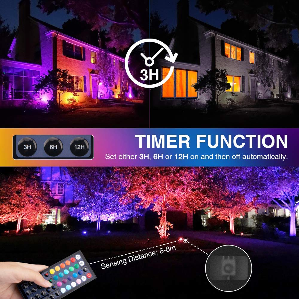 - TIMING & MEMORY FUNCTIONTiming function allows you to set the working time (3 / 6 / 12 h), this uplights will automatically turn off when setting time is up. Memory Function makes these color-changing spotlights stay at your last set of colors and light display mode when turning on again. No need to reset it.