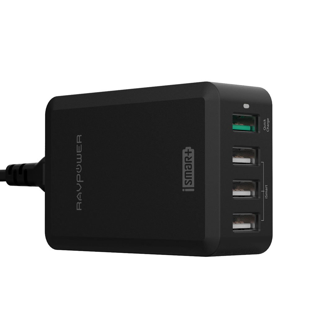 Color: Black The RAVPower RP-UC016 is a seriously small four-port USB desktop charger forconvenient charging while you work. Featuring three 2.4A charging ports and anextra port with QC 2.0, you can charge four devices including four tablets allat the same time. Introducing Fast Charging It’s not just enough in this day and age to have standard charging technology.This desktop charger features Qualcomm Quick Charge 2.0 technology thatgreatly reduces recharge time by charging compatible smartphones and tablets75% quicker. Of course even without a QC compatible device the port stillworks as a regular 2.4A charger. Small Size, Big Convenience No bigger than a deck of cards, the four port charger is ideal for desks and office spaces or at home in a living room so the entire family can charge. The base is covered with a non-slipping covering to add extra grip so the charger cannot be knocked off along with your phones! Compatibility King As a USB charger, it not only can charge smartphones and tablets but also arange of popular 5V USB powered devices such as speakers, Go-Pro cameras,lamps, fans, and more. Quick Charge 2.0 Compatible Models: Samsung Galaxy S7 / S6 / Edge / Plus, Note 5 / Note 4 / Edge LG G5 / G4, LG G Flex2, LG V10 Google Nexus 6 Xperia Z3/Z3 Compact/Z3 Tablet Compact/Z4 Tablet Motorola Droid Turbo, Moto X 2014 HTC One M9 / M8, HTC Desire Eye, HTC One remix Asus Transformer T100, Asus Zenfone 2 Yota Phone 2 Note:Qualcomm Quick Charge Technology is not supported by iPhone and iPad.However, they can still be charged at their full speed with the RAVPower QC2.0 Charger. What’s In the Box: 1 x 4-port QC2.0 USB charger (Model: RP-UC016) 1 x Outlet Cable 1 x User Manual 1 x Warranty Card