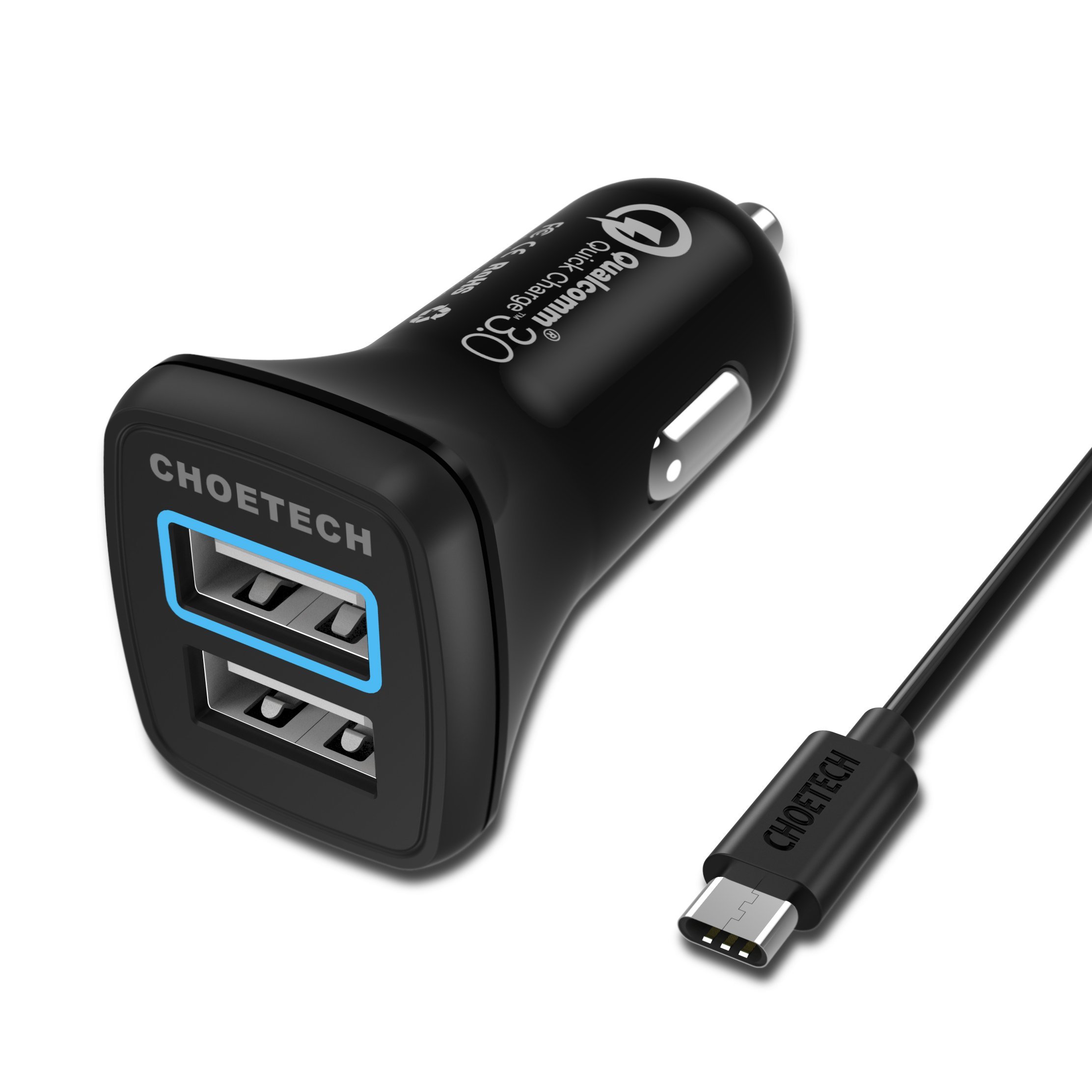 Quick Charge 3.0 USB Type C Car Charger, CHOETECH 30W Dual USB Car Charger with USB C Cable for Note 7, LG G5, HTC 10, Samsung, iPhone, iPad and more