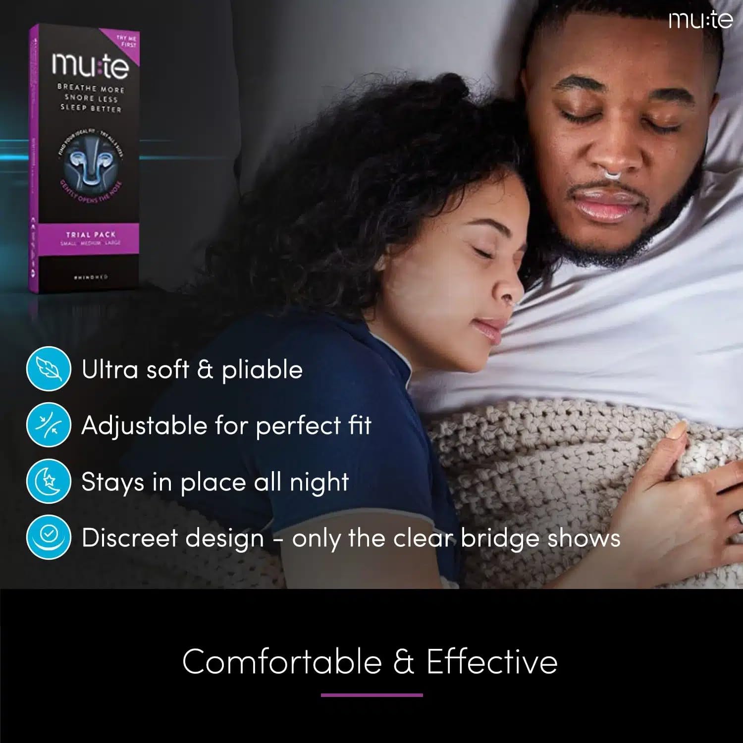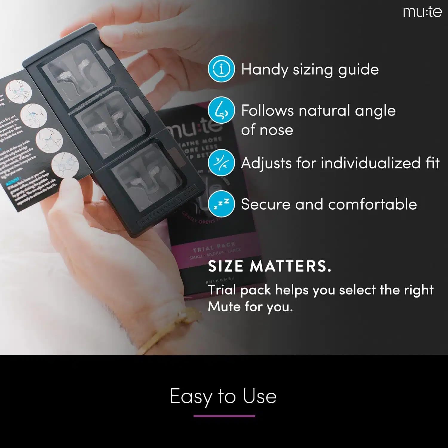 - COMFORTABLE; Trial Pack comes with all 3 sizes to find the best fit for you! Each Mute device has adjustable left and right stents for the perfect fit. Ultra-soft and comfy; the stents discretely dilate your nose and stay in place