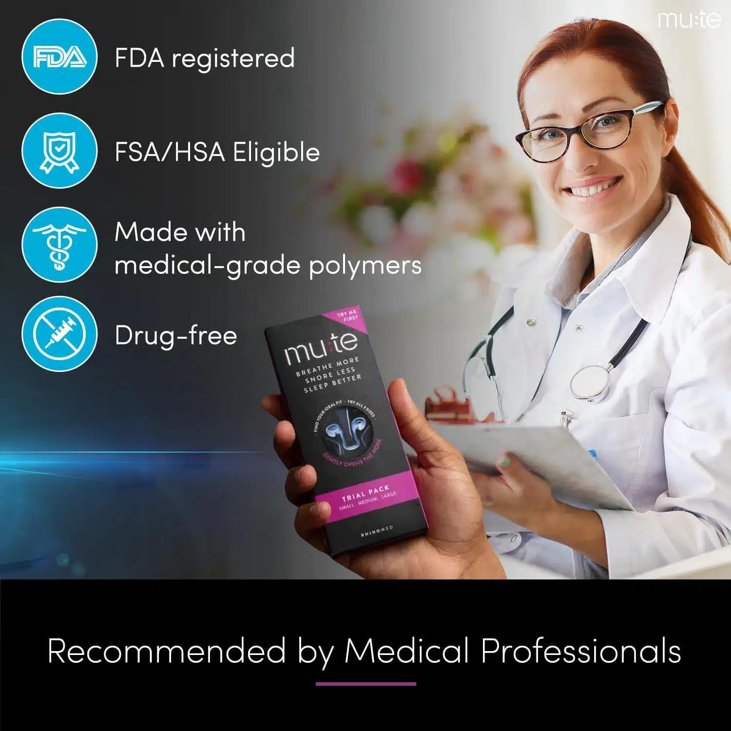 - CLINICALLY TESTED; Rhinomeds Mute nasal dilator for snoring reduction has been proven in clinical trials to increase airflow through nasal passages up to 38% over nasal strips.