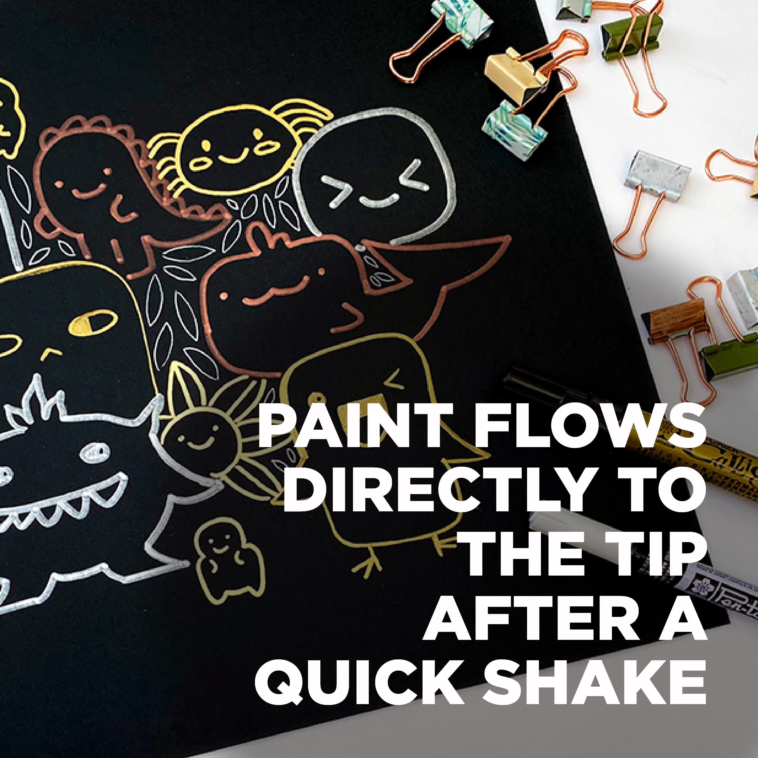 includes Extra Fine (0.7mm) paint markers in Gold, Silver and Copper. Paint