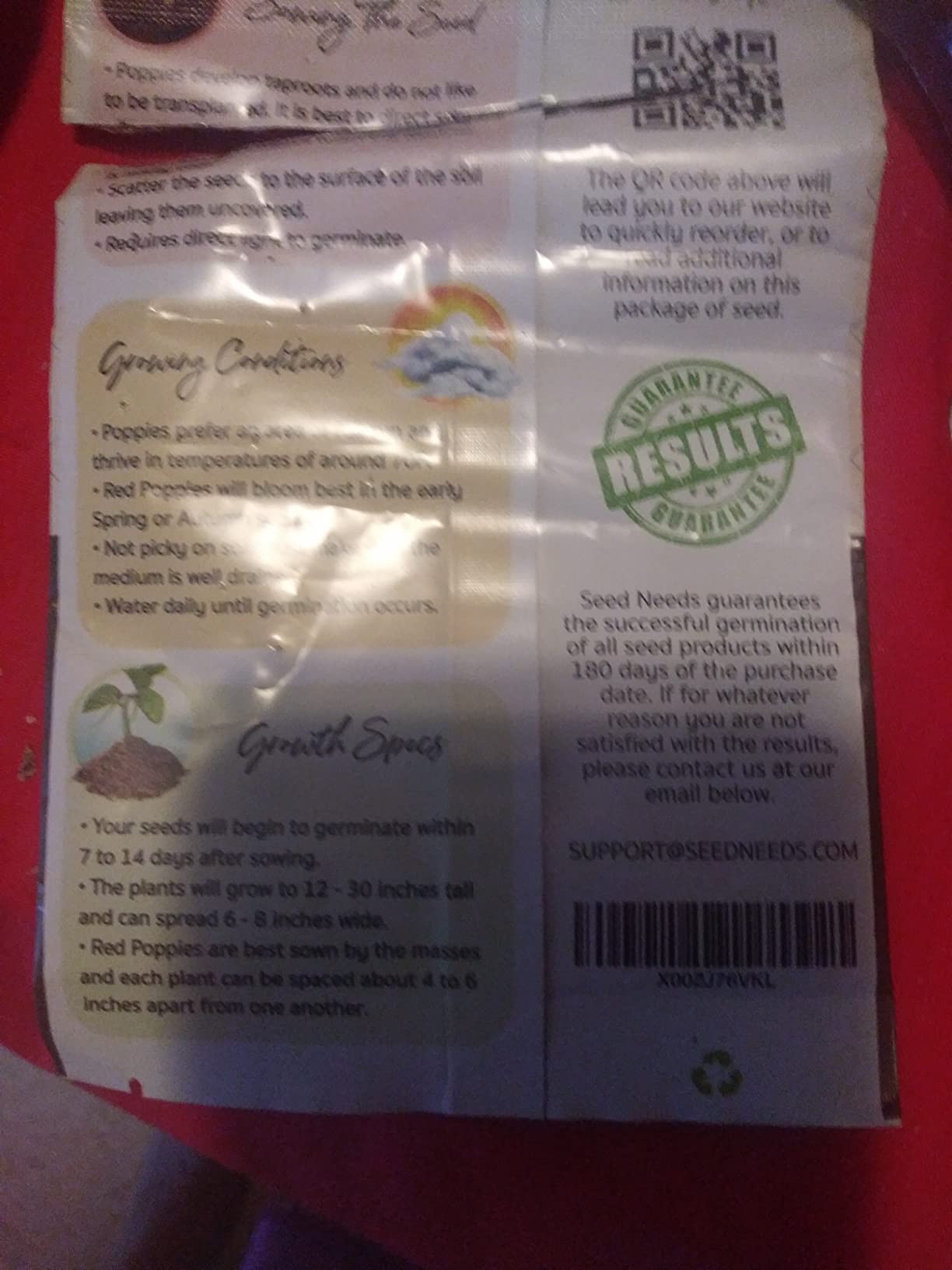 - Quality Poppy seeds packaged by Seed Needs. Packets are 3.25" wide by 4.50" tall and come with a full colored illustration on the front side, as well as detailed sowing instructions on the reverse.