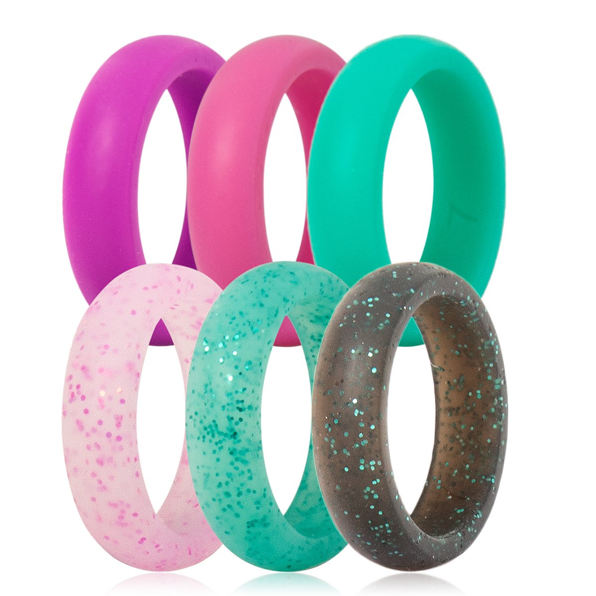 Silicone Wedding Ring For Women By DoerDo, Durable Rubber Sport Band For Active Style – 6 Rings Pack(Green, Pink, Purple, Black With Glitter, Blue With Glitter, Transparent With Glitter)