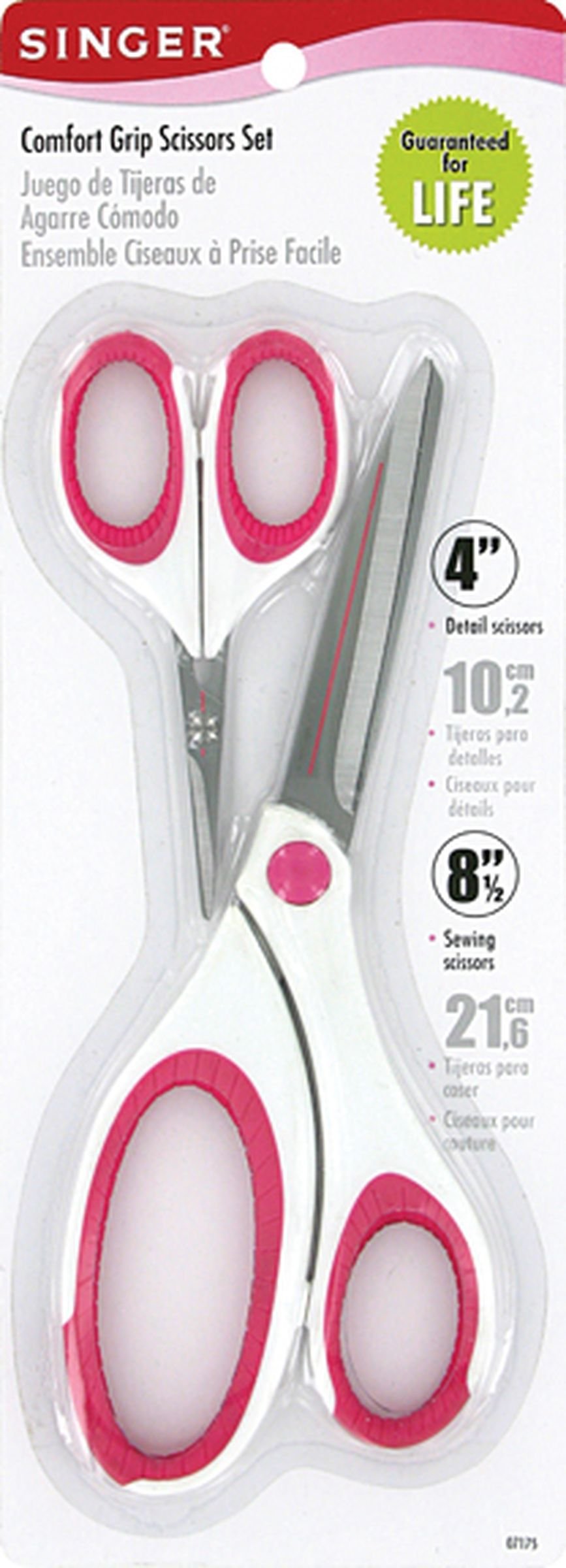 The Singer Sewing and Detail Scissors Set comes with a 8-1/2-inch sewingscissor and a 4-inch detail scissor that are guaranteed for LIFE. Bothscissors come with pink and white comfort grip handles that are rubberized tomake cutting easier on your fingers and eases hand strain. The handle designallows for comfortable right or left handed use.