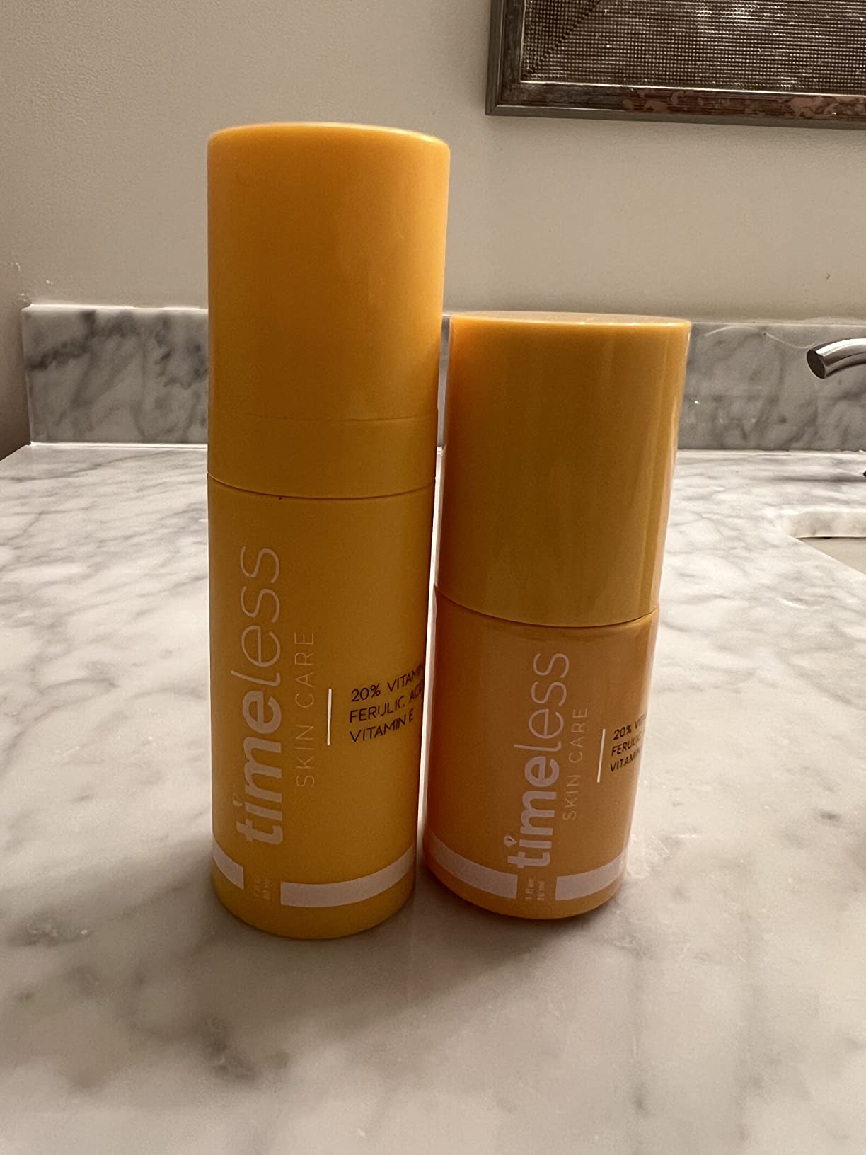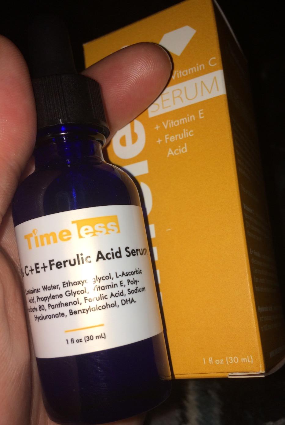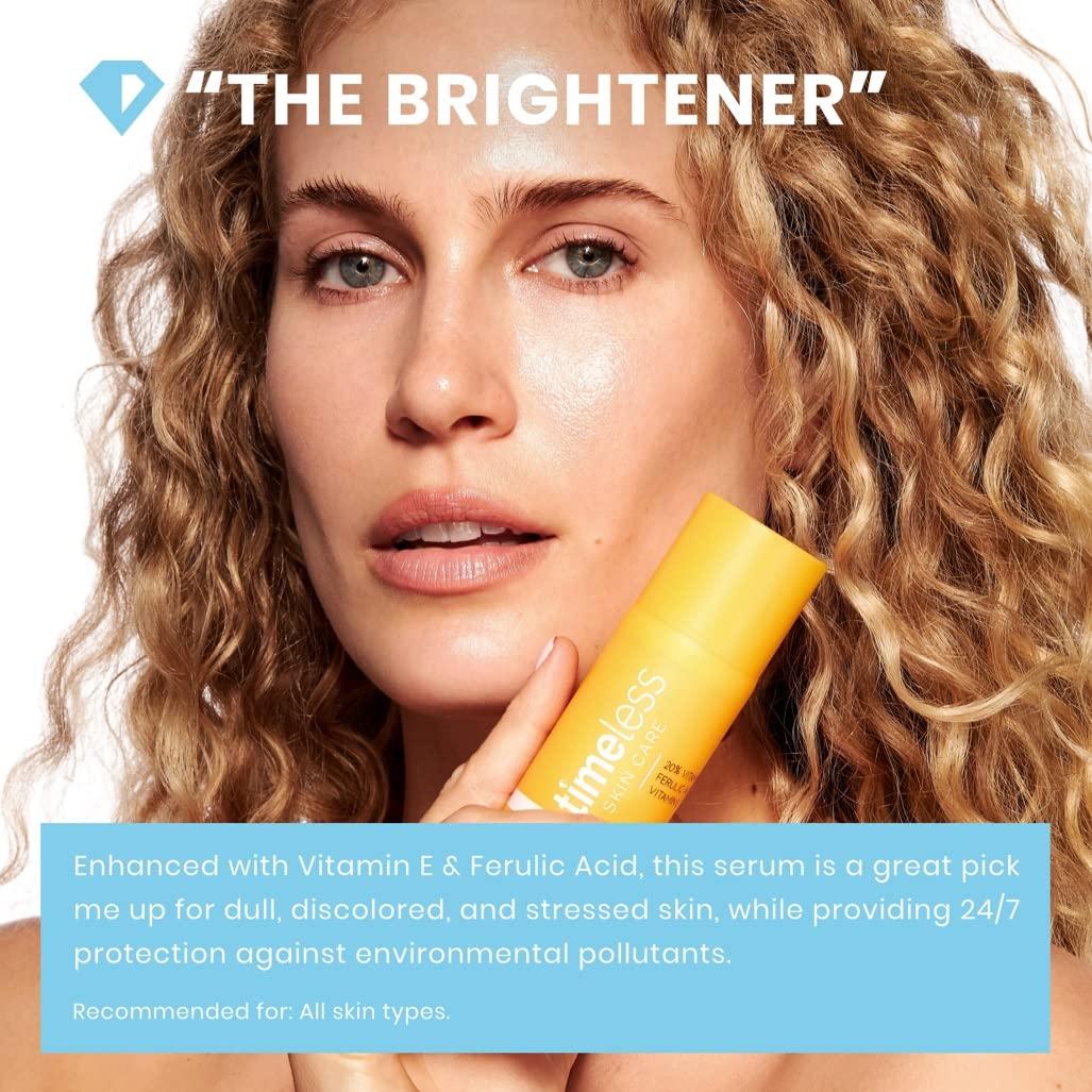 - BRIGHTEN & CORRECT – Timeless Skin Care 20% Vitamin C + E Ferulic Acid Serum brightens skin, builds collagen & evens out tone. Enhanced with Vitamin E & Ferulic Acid to correct hyperpigmentation + discoloration & promote healthy skin turnover.