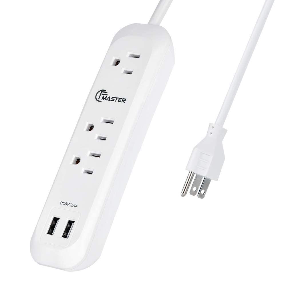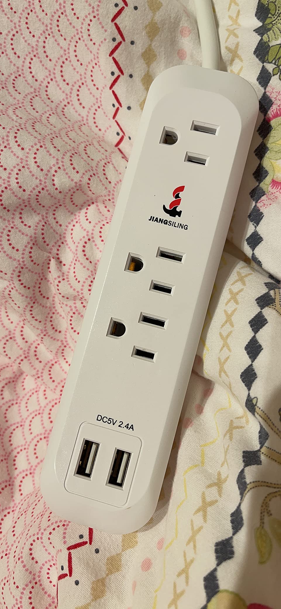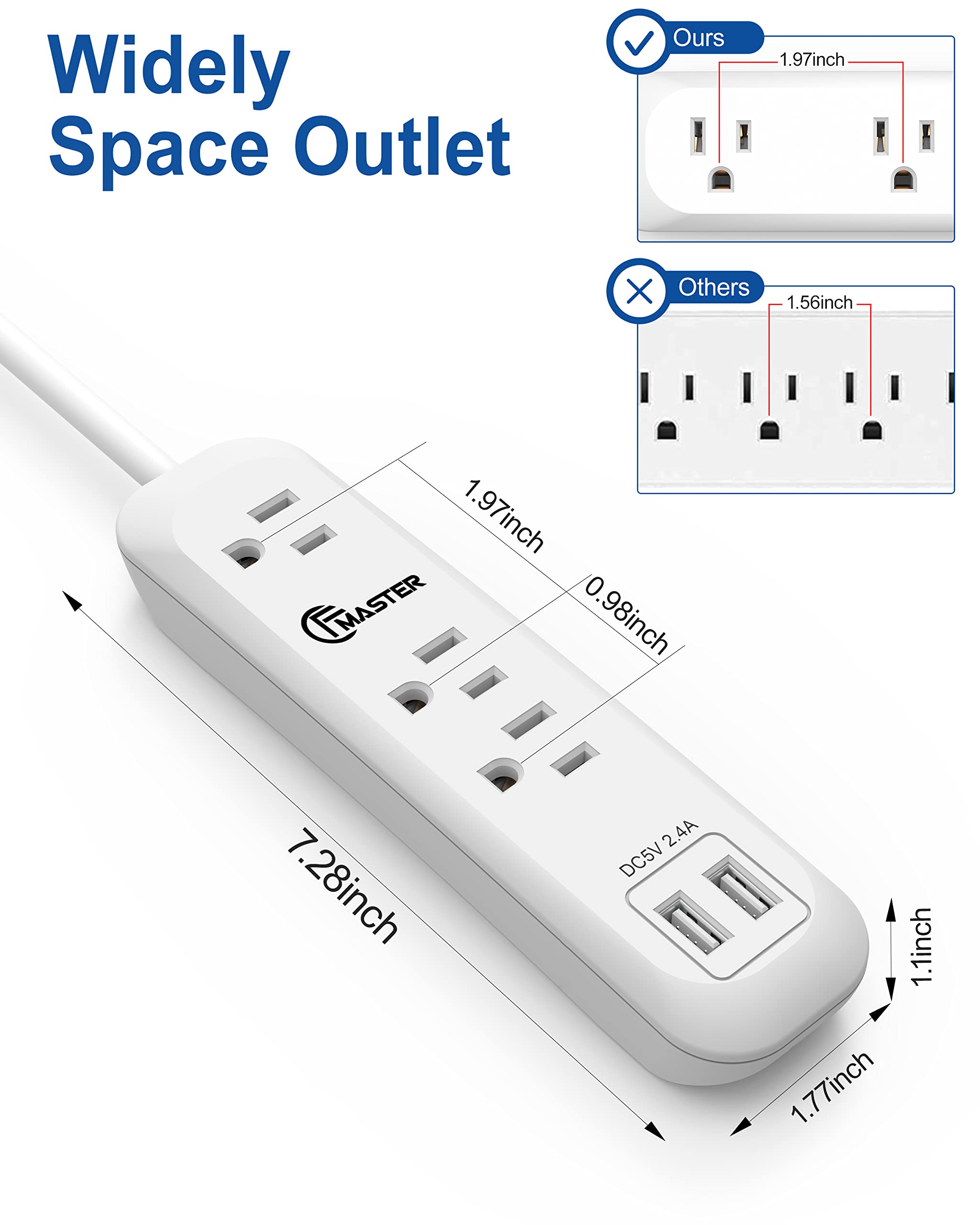 - Multi outletsThis extension cord surge protector has 2 Standard outlets and 1 extra wide spaced outlet to fit the bulky cell phone charger or Power adapter. And 2 usb charging ports(2.4A,12W)can gives your USB devices a very fast speed charge!