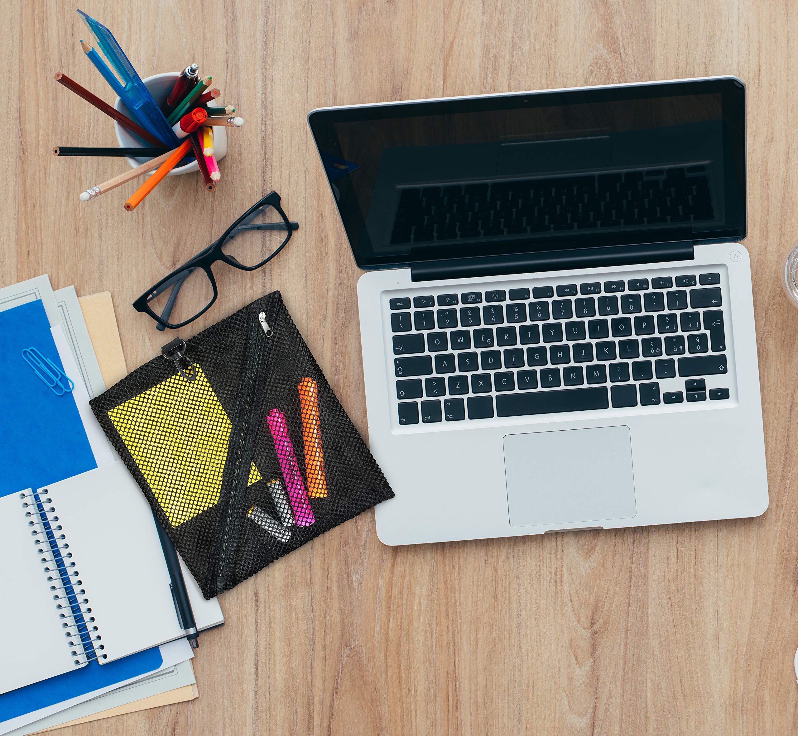 - STORAGE – Organize the chaos with these color-coded mesh storage bags! Great for organizing miscellaneous items like computer cables, chargers, notebooks, pens, and more.